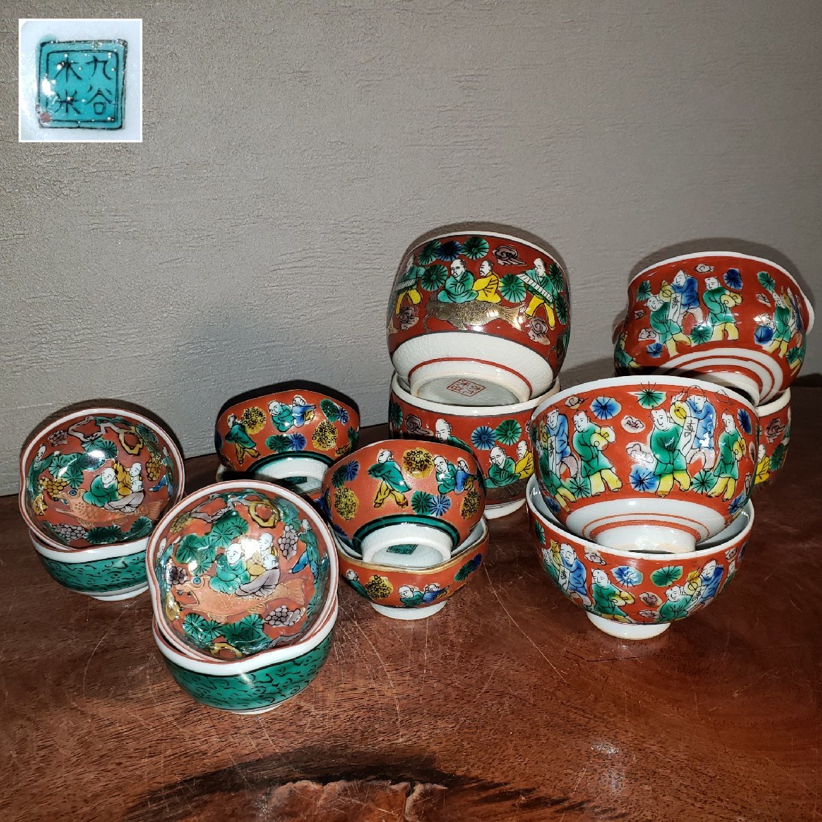 九谷木米の茶器セット(14客)です。手入れ等していない現状品となります。汚れ、擦れがあります。一部ヒビ、欠けがあります。