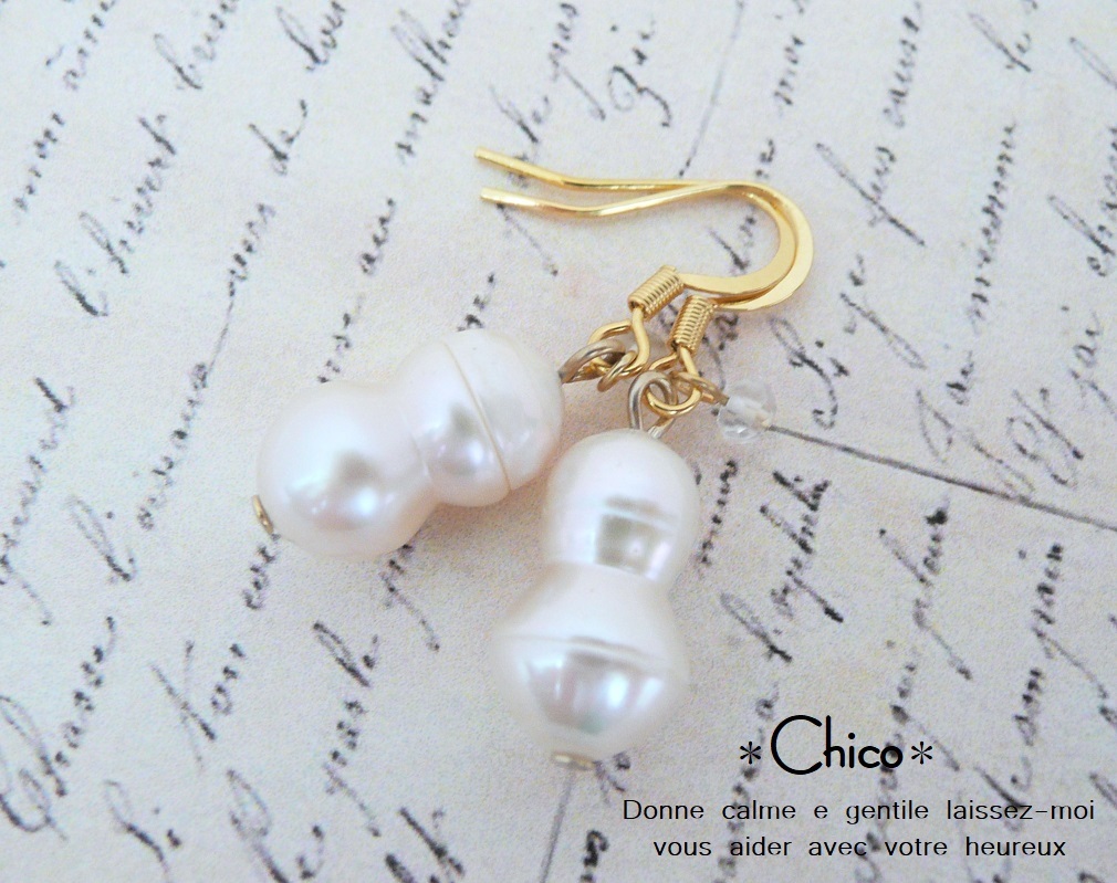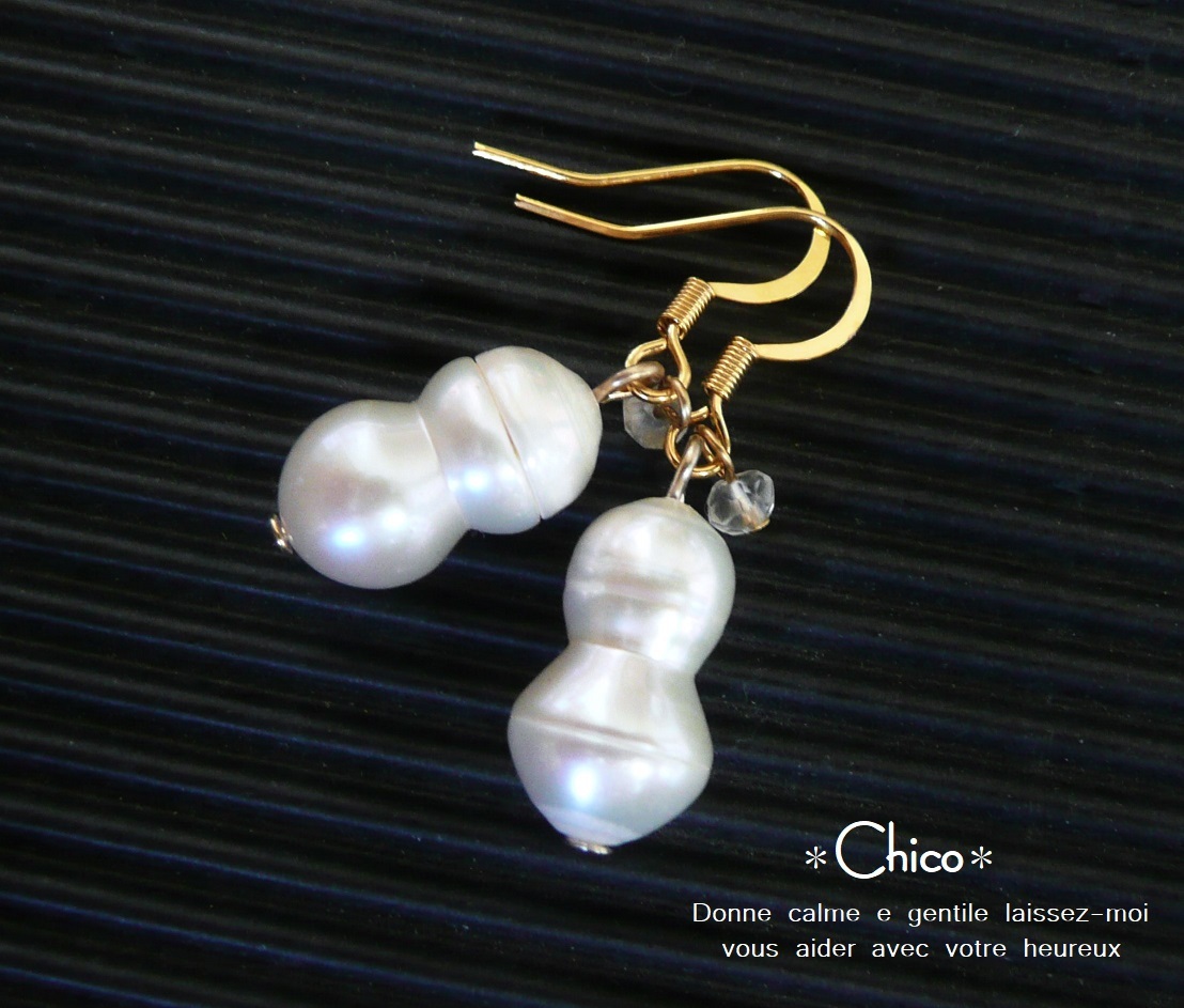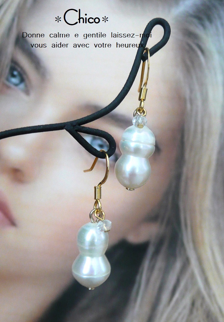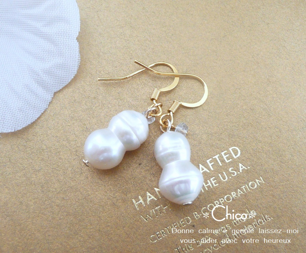 【サージカルステンレス製 ゴールド】 ホワイト淡水パール ツイン・雪だるま&クリスタル ハンドメイドピアス ♪ ★2点以上送料無料!★