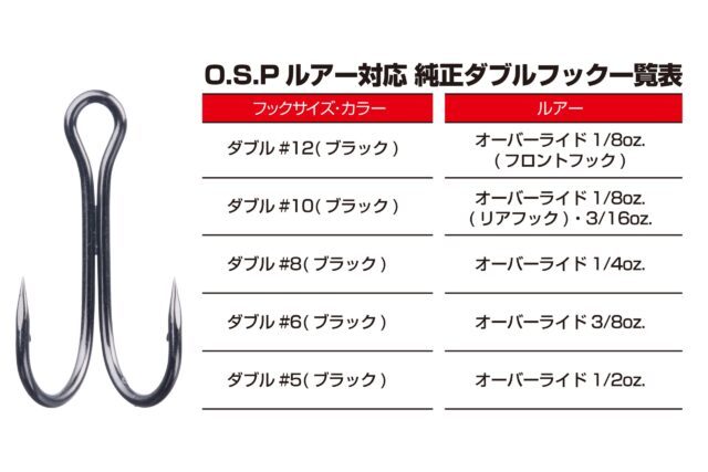 新品になります。 O.S.P純正スタンダートフック! O.S.Pの各ルアーにマッチした取り換え用フックです。トレブルフック、ダブルフックをラインナップ。サスペンドタイプのルアーはもちろんのこと、パッケージング時のベストバランスでお使い頂くことが可能となります。 |
