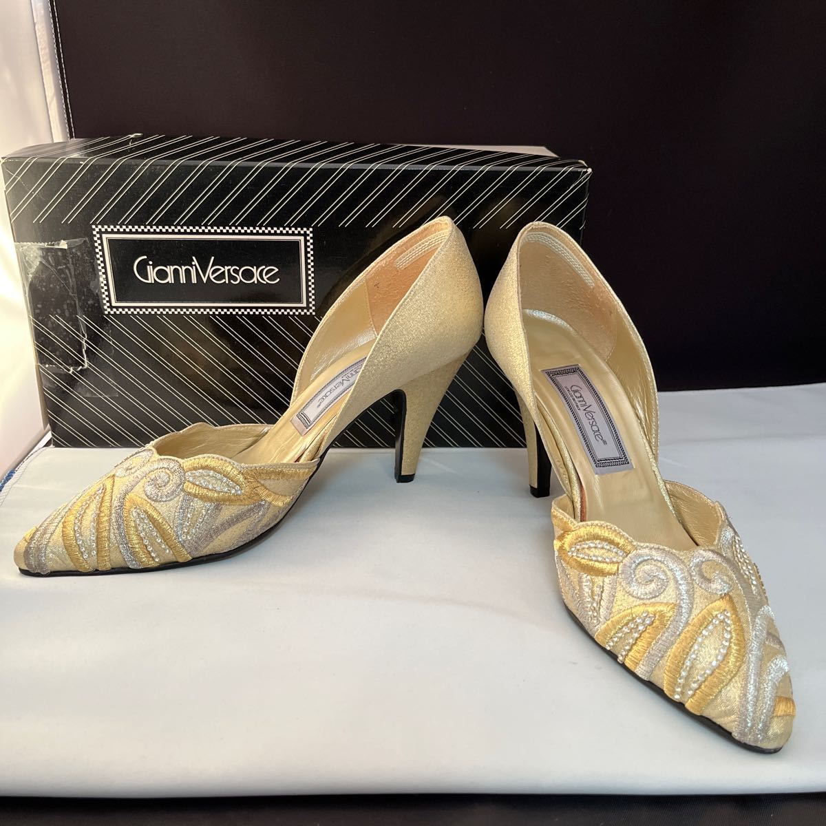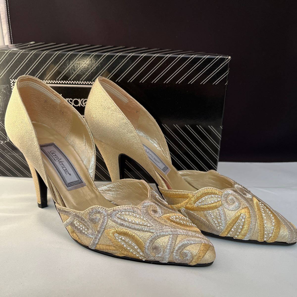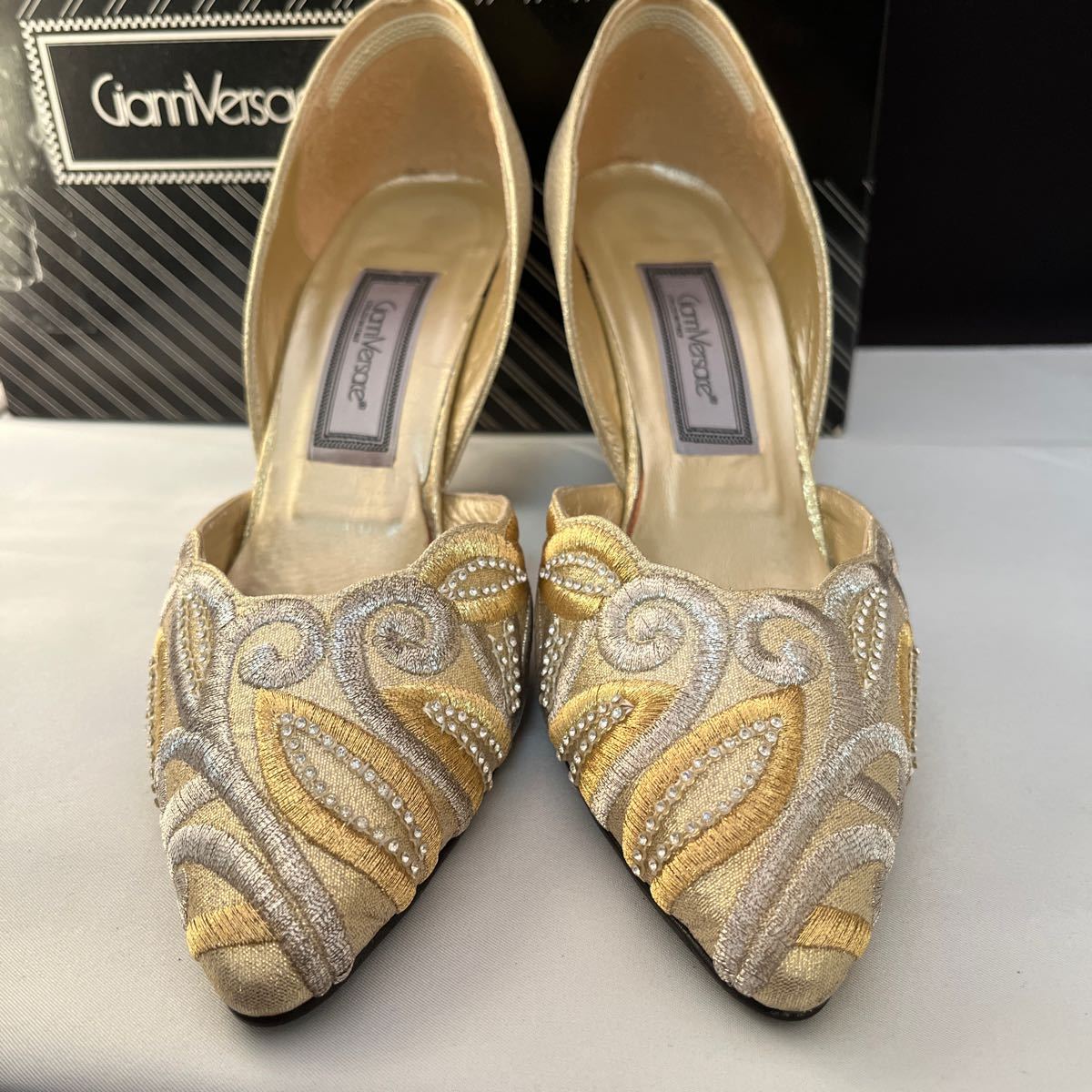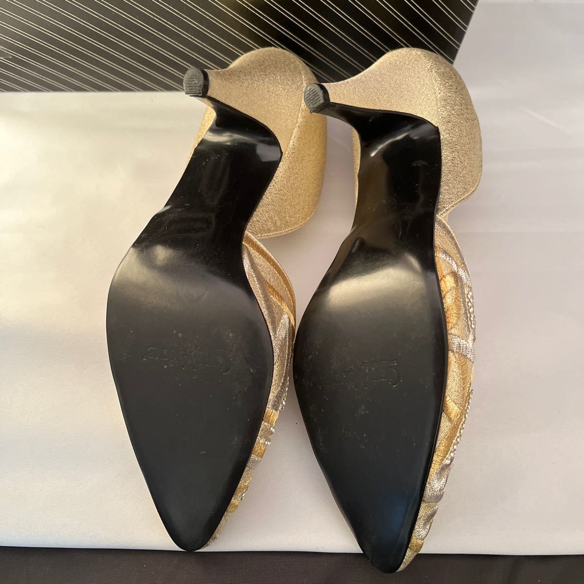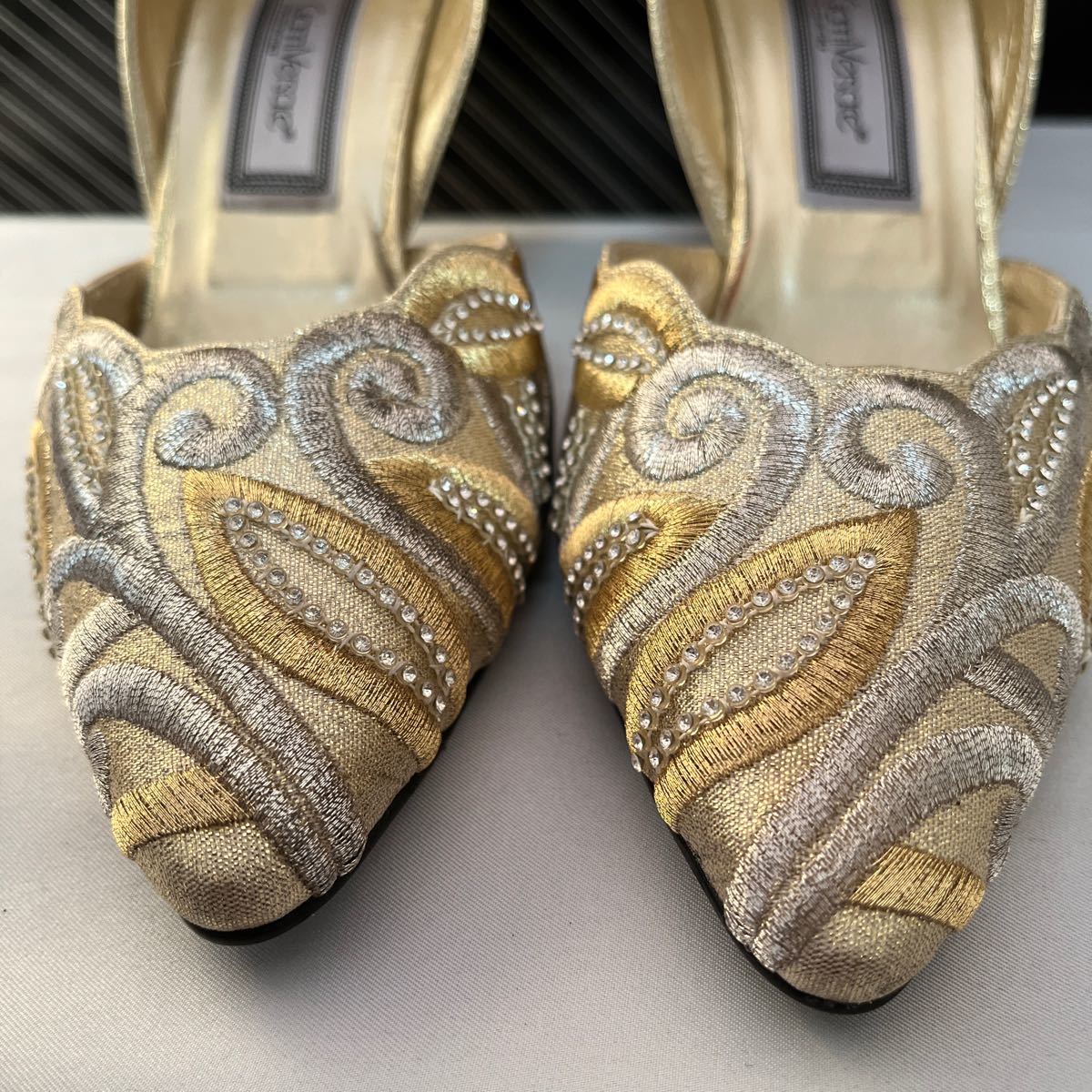 ゴールドとシルバーの刺繍が施された大変綺麗なデザインのパンプスです