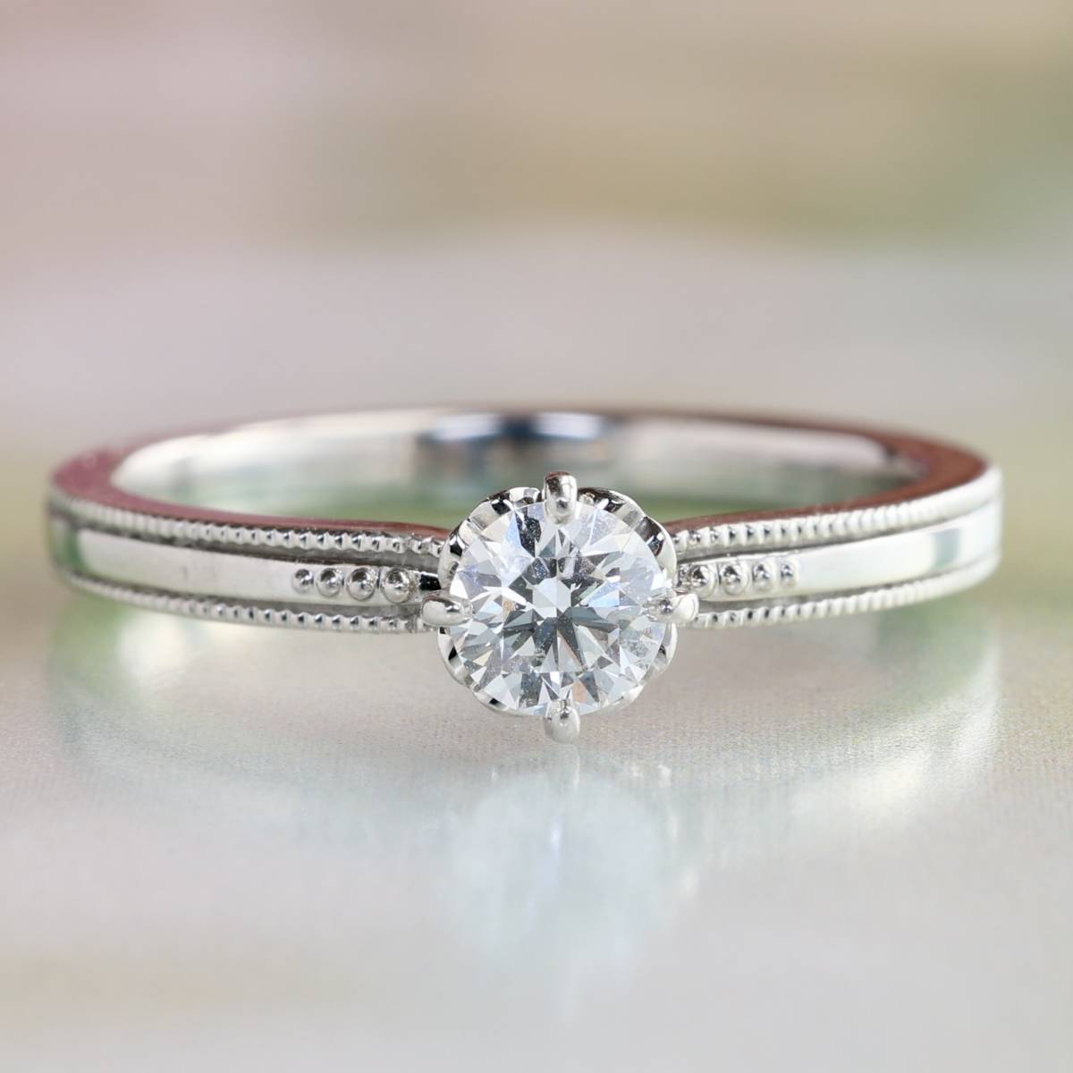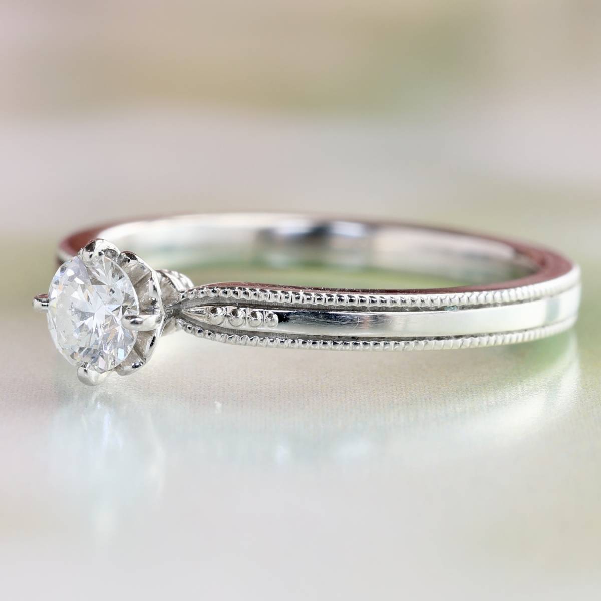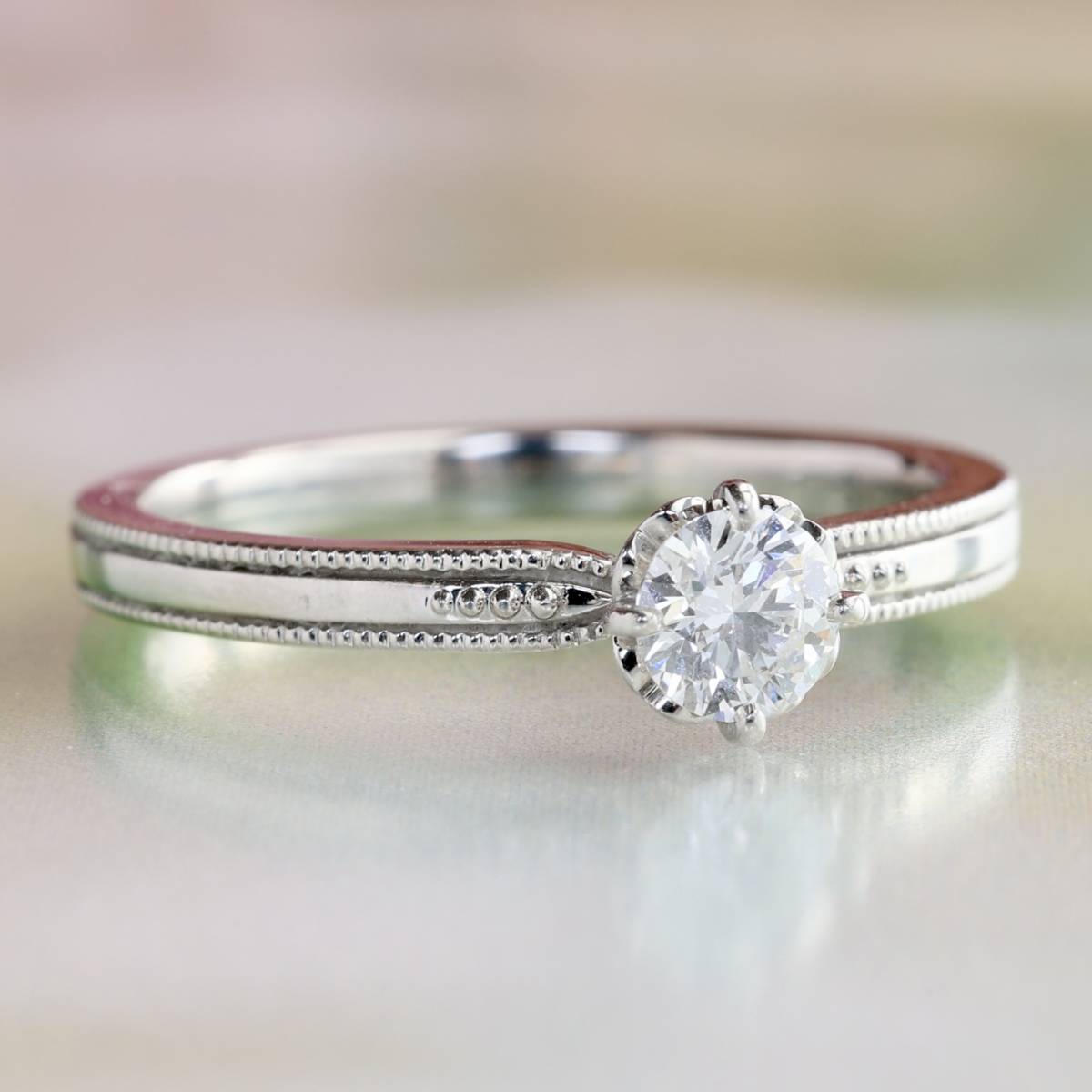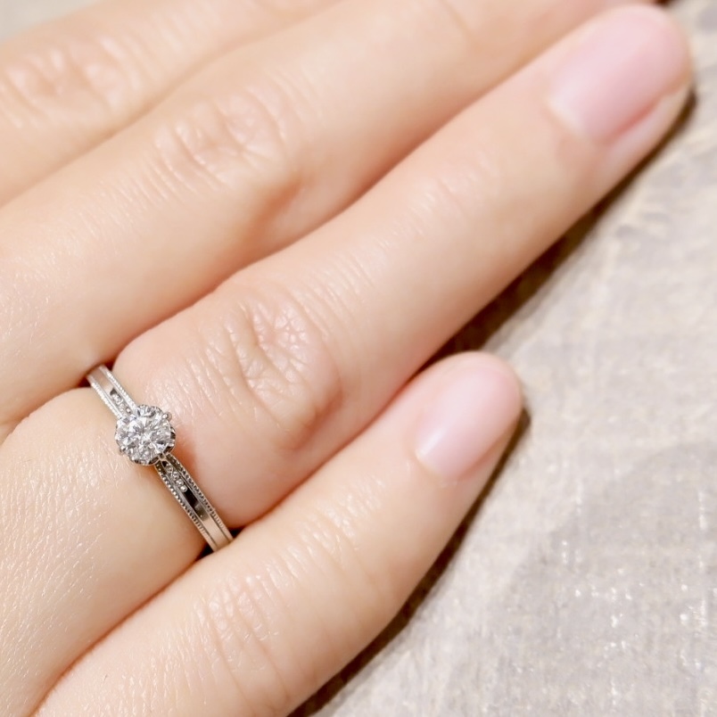 上質なダイヤモンドが美しい輝きを放ち、枠にはミルグレインが丁寧に施されています。