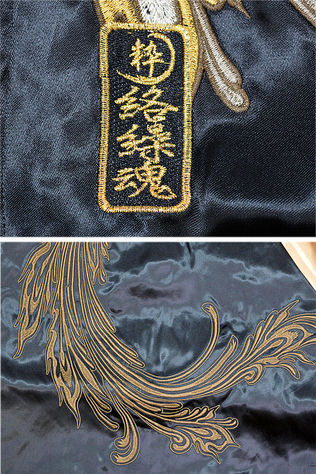 絡繰魂さんから「粋 牡丹鳳凰天翔リバーシブルスカジャン(234117)」のご紹介です。 重みを感じる程の刺繍量が魅力的な絡繰魂から、最新作のスカジャンが登場しました。 今回モチーフの主役に採用されたのは、美しい鳳凰。 背中には巨大な鳳凰をダイナミックに落とし込みました。 色づいた牡丹が組み合わされており、鮮やかなカラーリングが魅力的。 背景に描かれた稲妻は身頃から袖へと続いており、実際に着用した際には体がより立体的に浮かび上がります。 裾にはブランドロゴを印風に刺繍しました。 表面はしっかり柄の入ったスカジャンですが、対象的に裏面はシンプルに仕上げ、メリハリを付けました。 ボディーにはレーヨンサテンを使用し、ドレープや陰影がくっきりと現れています。 | ||||||||||||||||||||