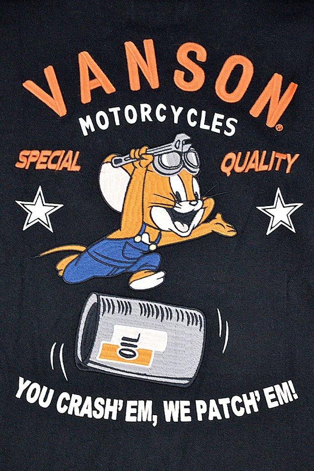 上質なレザーを使って生み出された数々のアイテムがバイカーに大人気のvansonから「vanson×TOM&JERRY 天竺ロングTシャツ(TJV-2401)」のご紹介です。 体が大きく凶暴だが、おっちょこちょいでどこか憎めない部分のある猫のトムと、体は小さいが頭脳明晰で、追い掛けてくるトムをことも無げにさらりとかわすネズミのジェリーのドタバタを、ナンセンスとユーモアたっぷりに描いたアニメ作品をモチーフにしました。 背中にはメカニックに扮したジェリーの姿が刺繍で描かれています。 バックにしっかり柄を入れている分、フロントはシンプルに仕上げ、メリハリを付けました。 左袖にはジェリーの刺繍ワッペンが縫い付けられています。 ボディーには、綿100%の天竺Tシャツ生地を採用。 | |||||||||||||||||||||||||