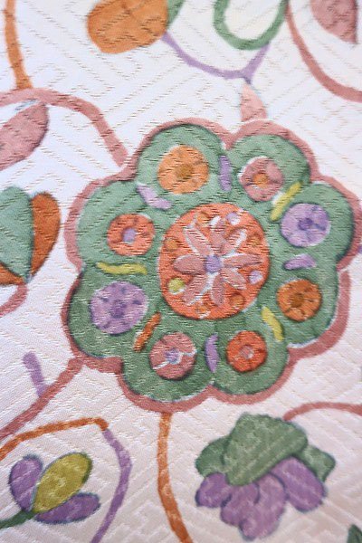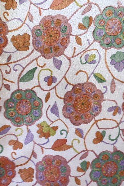 ベージュの絹地に唐花や花紋が描かれた可愛らしい小紋です。 習い事やお出掛けにいかがでしょうか。 担当:石井 |