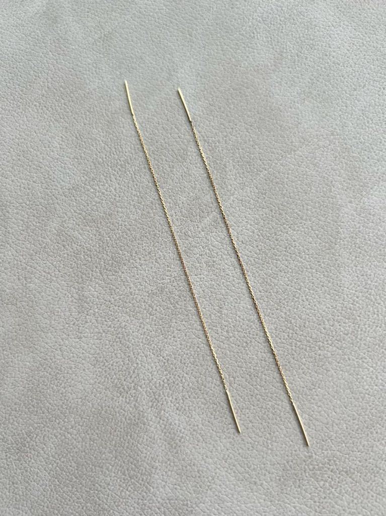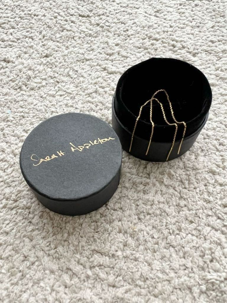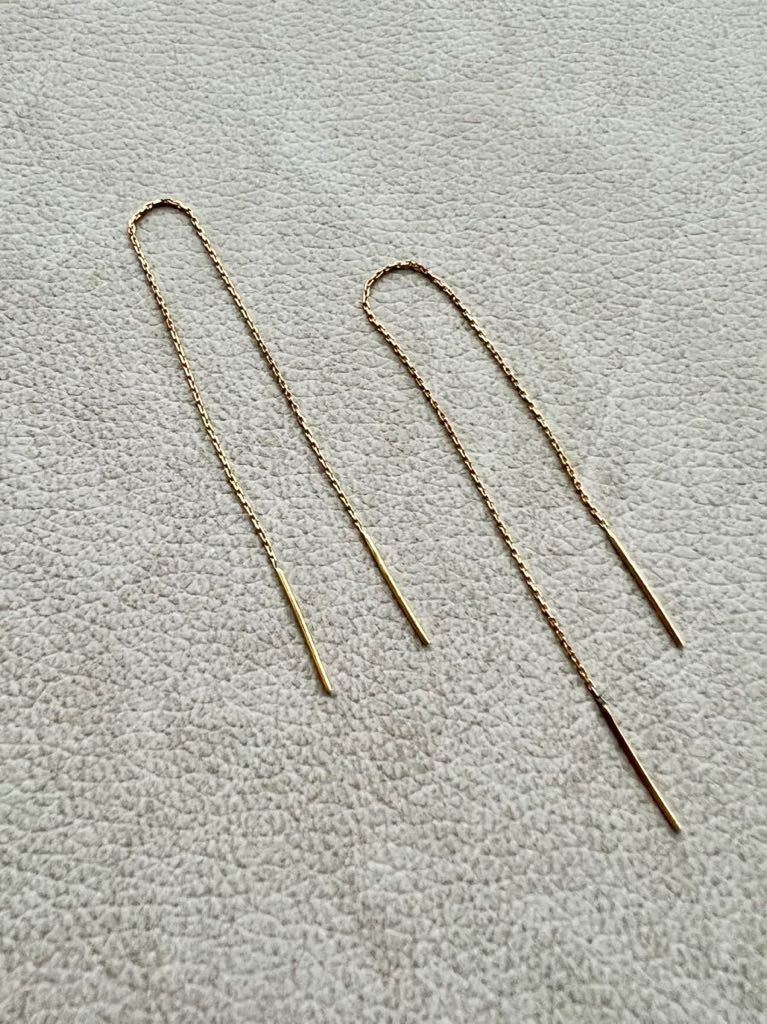 ピアスホールにチェーンを通すデザインでモードな印象に。