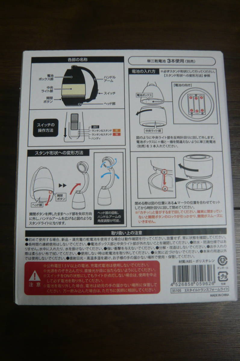 『 3style Transform Light 』 ケトルのような取っ手が付いたミニ照明です。 置き型のランタンとして周囲を照らしたり、 非常時にはスイッチでスポット照明に切り替えて ハンディライトとしても使用できます。 更に持ち手を変形させて卓上ライトにもなる3WAY仕様。 普段使いから防災グッズとして幅広くお使い頂けます。 【商品仕様】