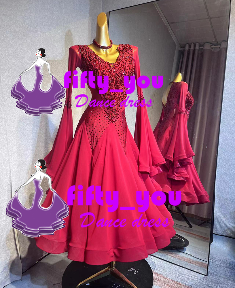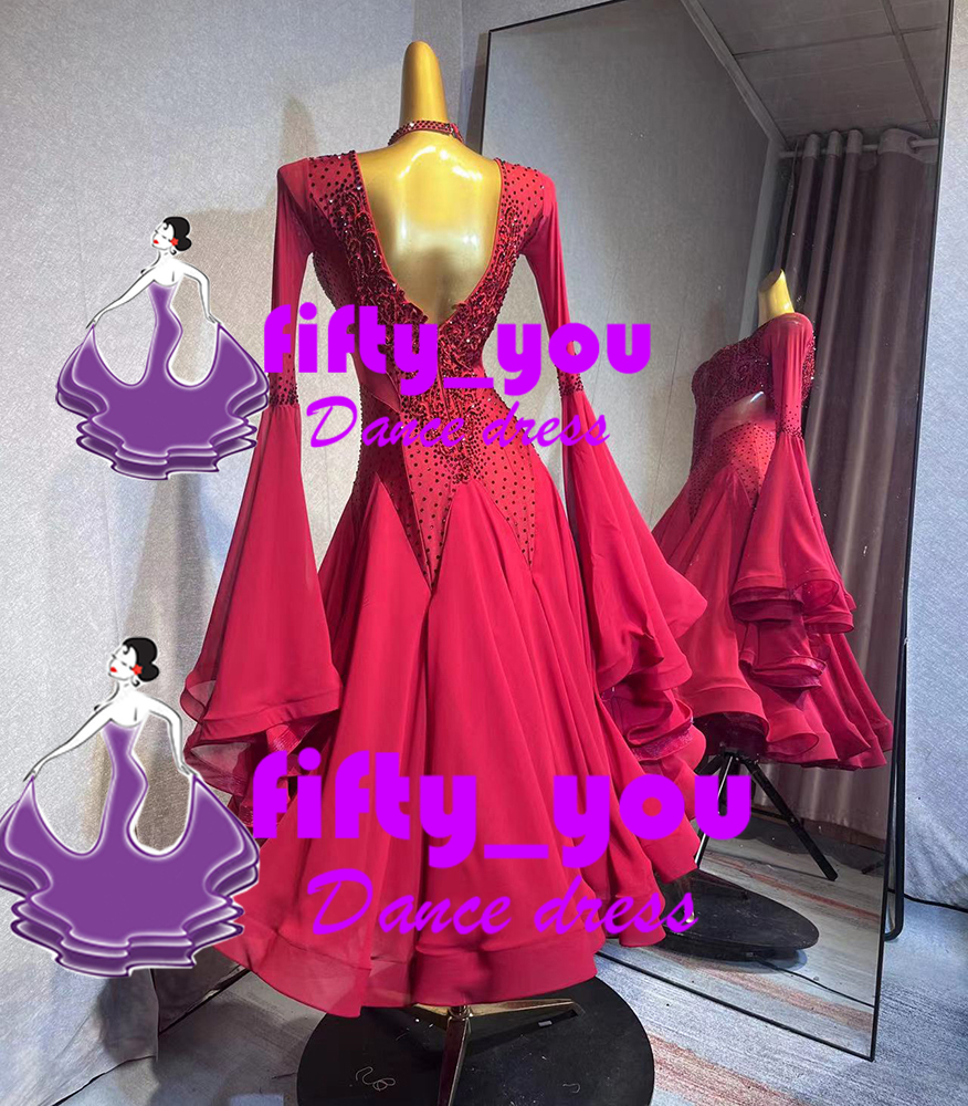 新品fifty_you セミオーダードレス レディース社交 ダンスドレス  モダンドレス パーティドレス ワルツ競技用 濃いワインレッド