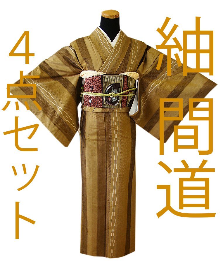 | ちょっと一言 | 暮らしのお洒落着に重宝頂ける間道柄の粋な雰囲気漂うハリやシャリのある紬4点セットです。 帯や小物次第で様々な表情をお愉しみ頂けることでしょう。 |