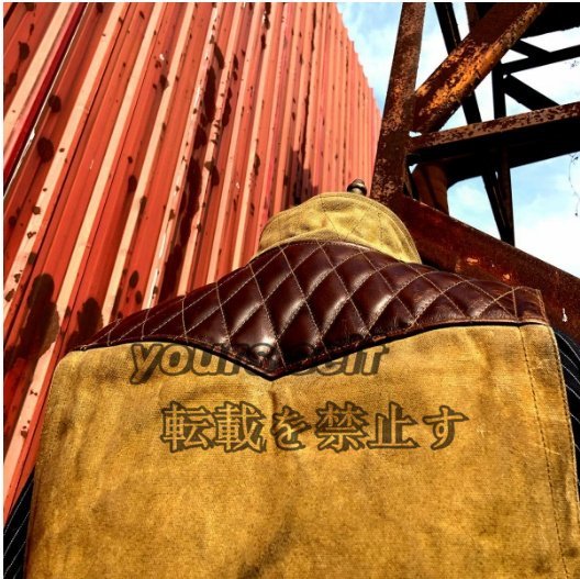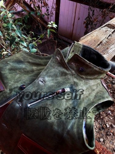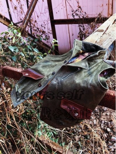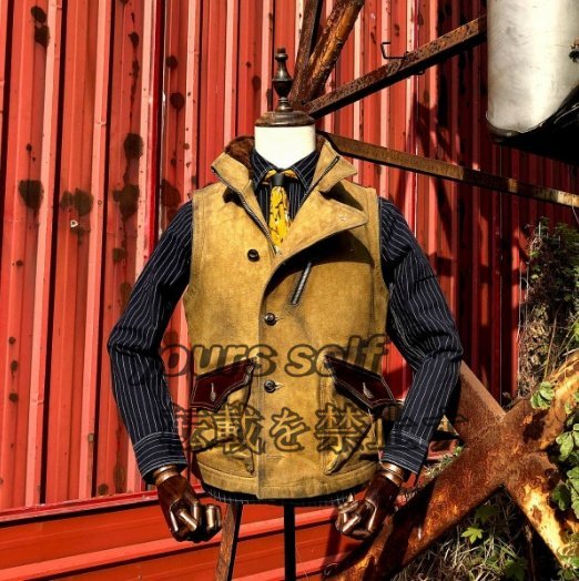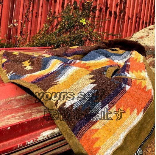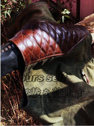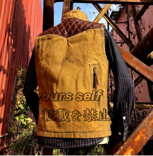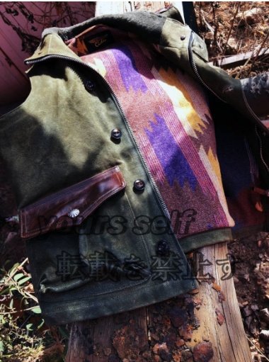 雰囲気抜群のコットンキャンバス×レザー×ナバホブランケットの裏地 ライダースベスト カーキ本革 S~2XL