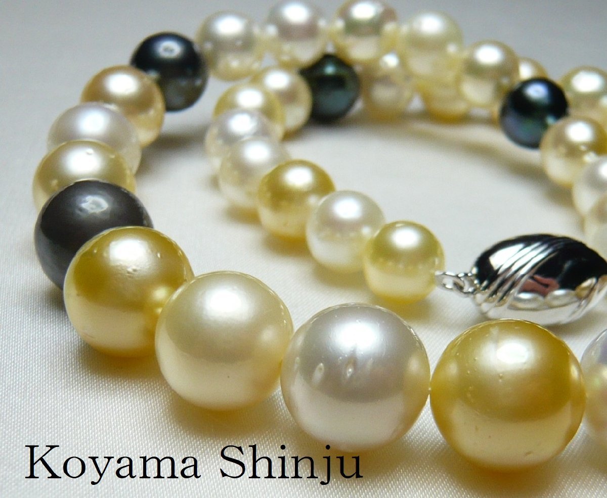 商 品 詳 細 | 即買特価!現品限り!白蝶/黒蝶真珠マルチネックレス! 即買特価!送料無料!絶品カラー!白蝶真珠/黒蝶真珠マルチパールネックレスです。 透明感のある天然カラーのホワイト、グリーンピンク、シルバー、ゴールド、クリーム、ブラック等のパールをバランスよく組み上げた可愛いマルチネックレスです♪ 画像では表現しきれない美しさです!めっちゃ綺麗ですよ! カラフルな色目に仕上がりましたので、どんな服にも似合い、シーズンを通してお使い頂けますよ(^。^) パールサイズも8.0ミリ-12.5ミリありますので、思ったよりボリュームがありますよ。 クラスプは脱着容易なプッシュ式差し込みタイプです。 7枚目の画像は大きさが分かるようにあこや本真珠の7.5-8.0ミリネックレスを並べて撮影しましたが、明らかに大きさが違いますね(^ ^;) 画像ですべてを表現できませんが、本真珠の証とも言えるキズ、エクボ、細胞痕、小突起等があります。 当方発行の保証書、お手入れクロス付きです。おまけもありますよ♪ | ||