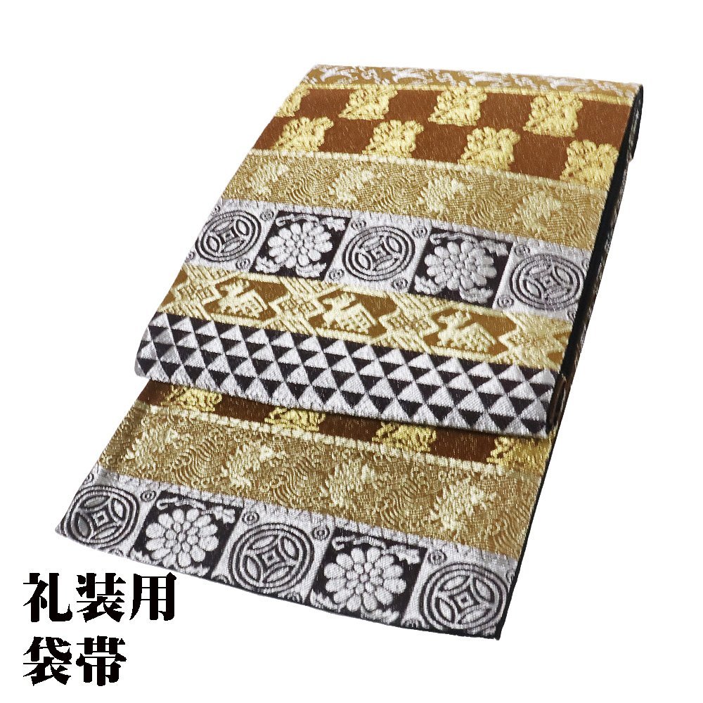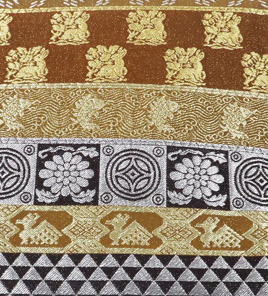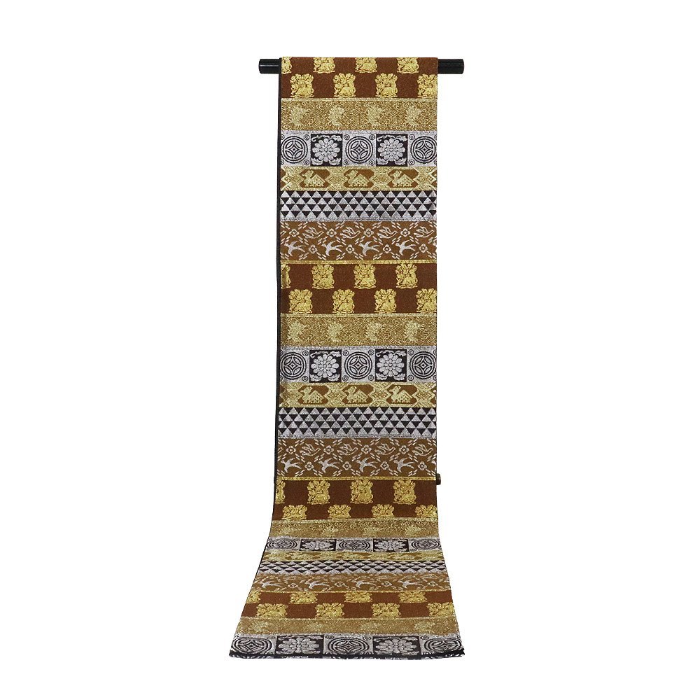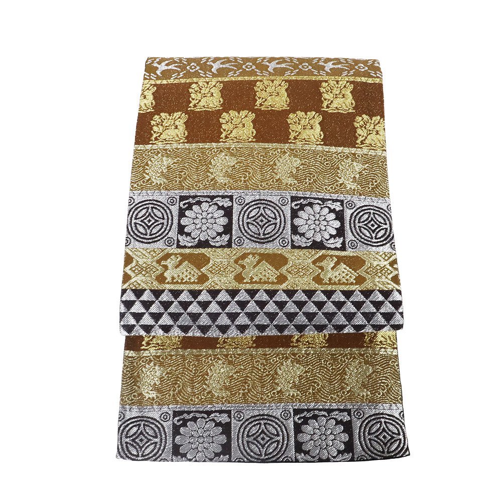 | 西陣織袋帯 金・銀・茶色・緑地 名物裂 荒磯・花兎・有栖川文様・七宝文・鱗文・鳥 仕立て上がり |