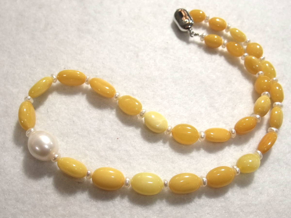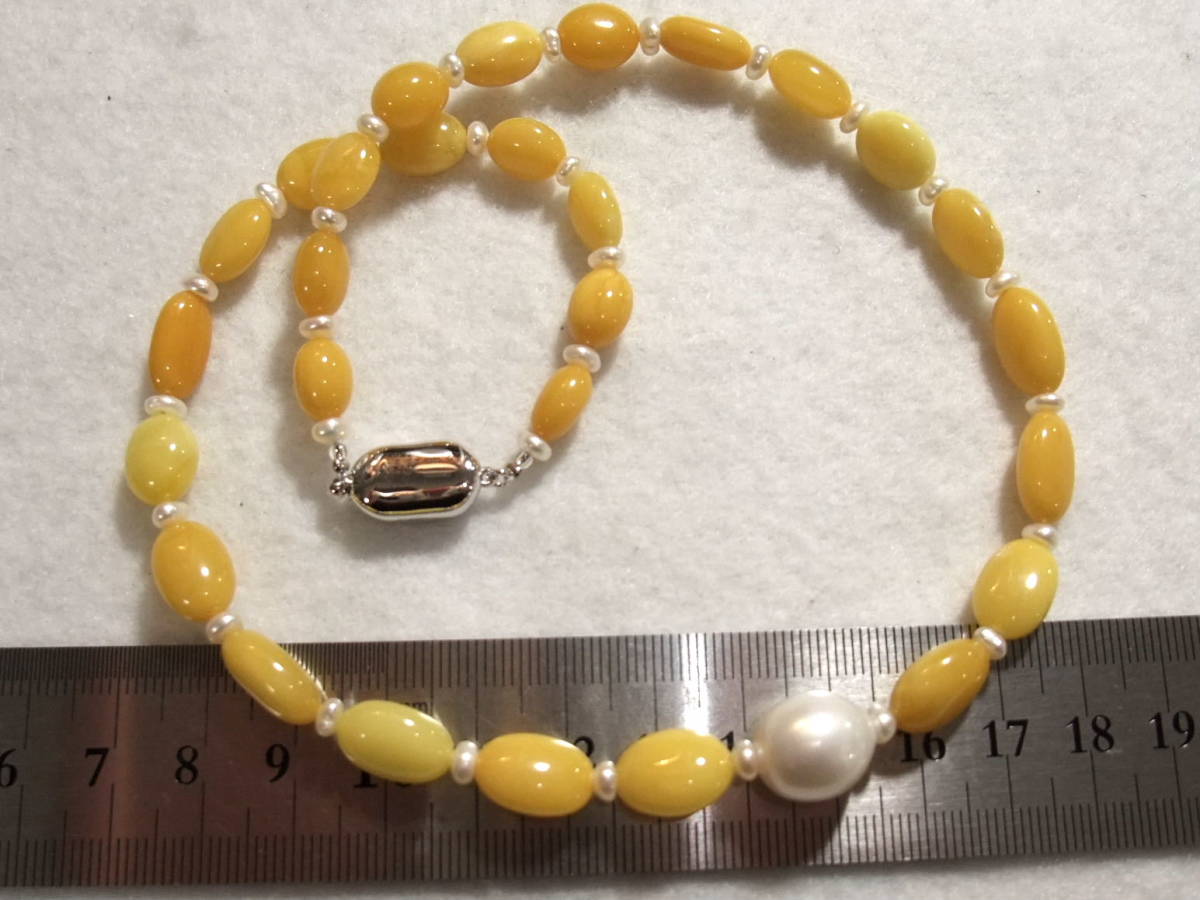 蜜蝋色の明るい黄味系の琥珀も綺麗な白の淡水真珠も年々価格が高騰していますので、やや古い在庫とはいえ、この品質でこの価格ではとってもお得です♪金具はシンプルなデザインなので、アンティークなゴージャス系の留め具などに付け替えていただければ、もっとリッチな見栄えの良いお品になると思います♪製作やリメイクのデザイナーさんや製作業者の方にもお素材としてもお薦めのお品です♪☆