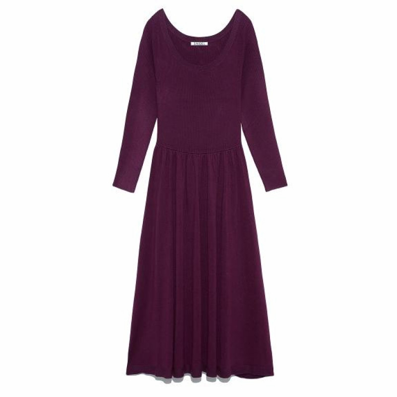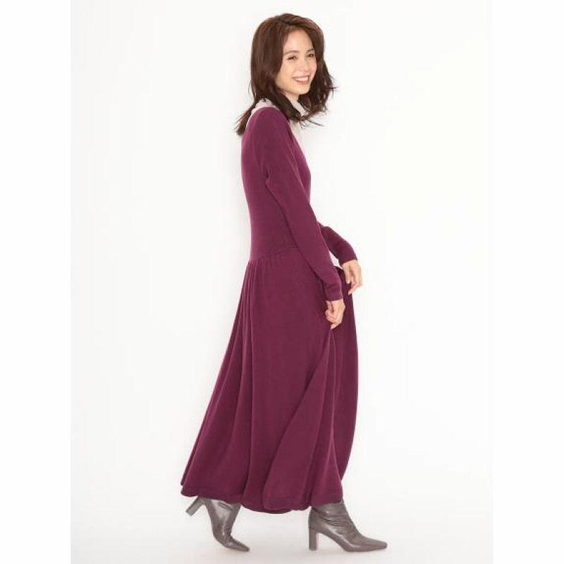 デコルテラインを美しく魅せる、深めのUネックが印象的なロングニットワンピース。