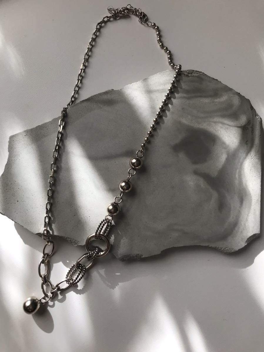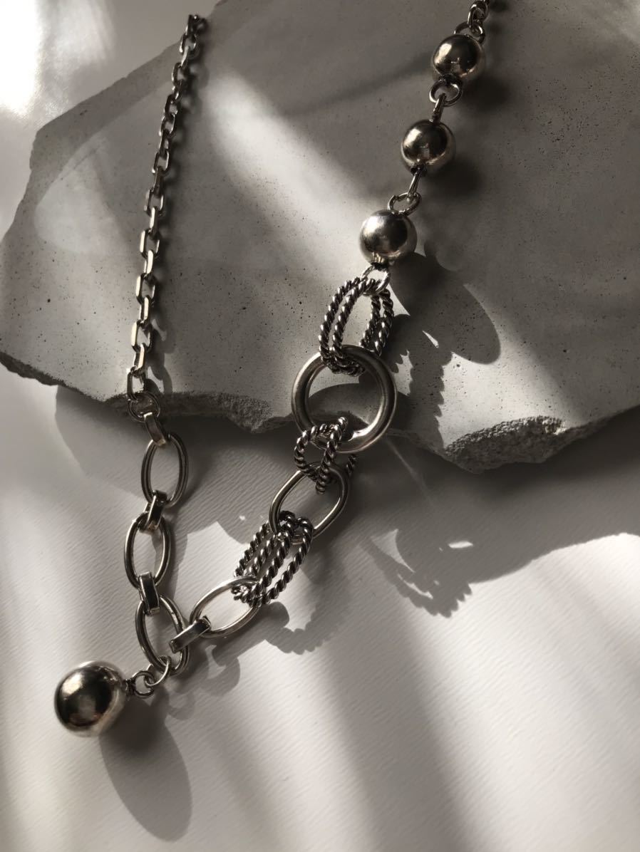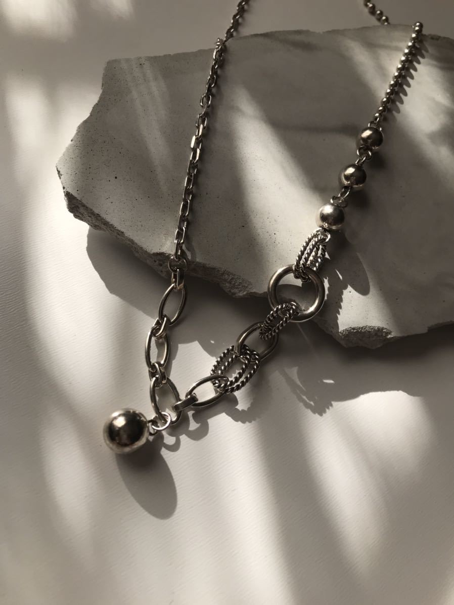 様々なチェーンを組み合わせたスタイリッシュで個性的なネックレス。異なるデザインのチェーンがそれぞれ絡み合い、独自の美しさを持っています。一つひとつのチェーンが見事な存在感を放ち、あなただけのスタイルを演出します。シンプルな服装にも華やかさを与えるこのネックレスは、あなたの個性を際立たせるための一品となることでしょう。自分自身や特別な方へのプレゼントとしてもおすすめです。ネックレスアジャスターに925刻印があります
