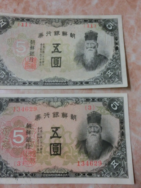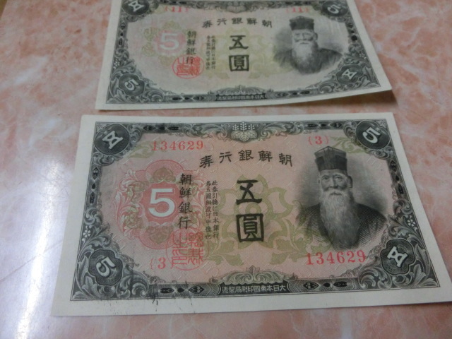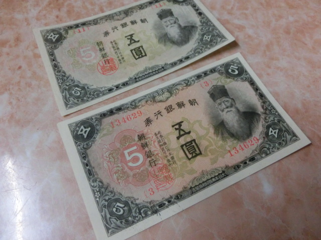 朝鮮銀行券 朝甲5円券の番号有り・番号なしの2種2枚セットです。