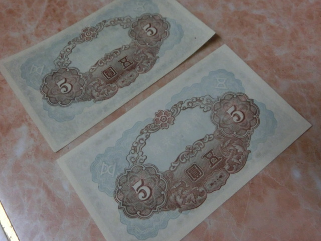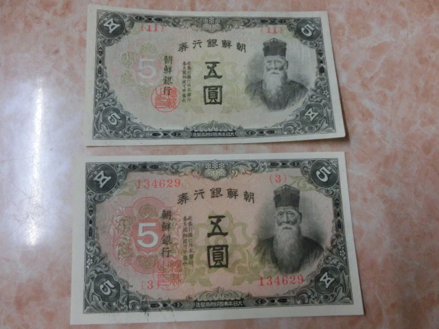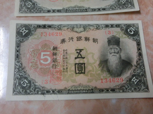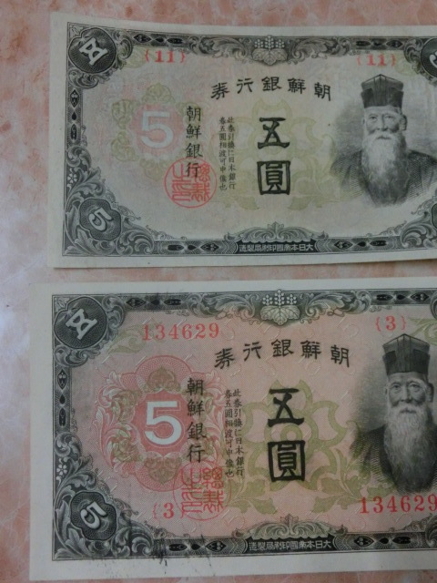 ★ 朝鮮銀行券 朝甲5円券 番号有り・番号なし 2種2枚セット 未使用~準未使用 ★ No.8