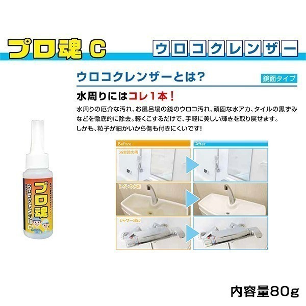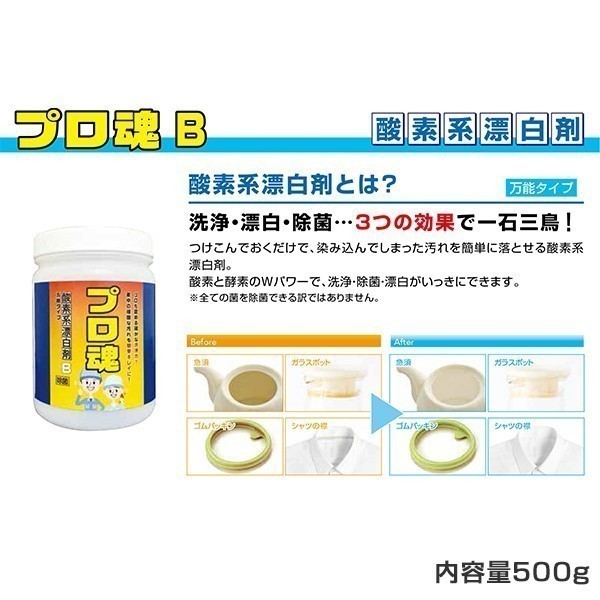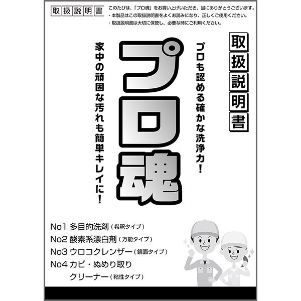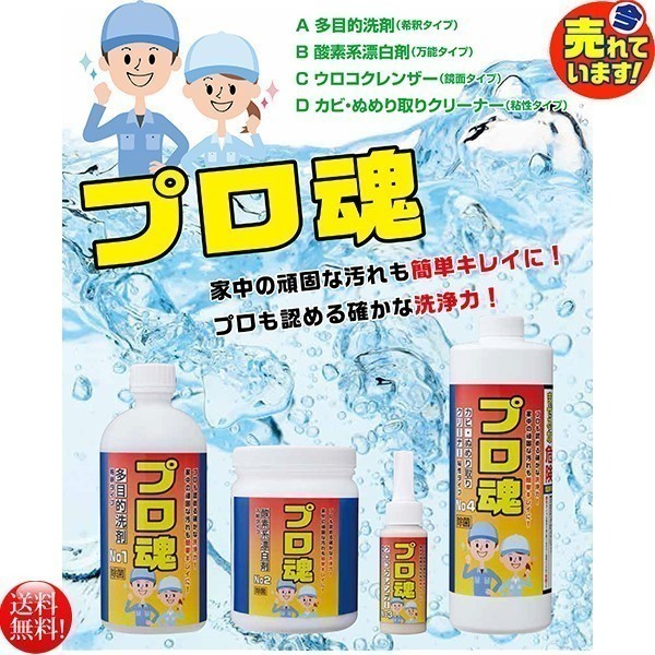 プロも認める本格派実力洗剤 家庭向け洗剤セット プロ魂 ![]() ・家中の頑固な汚れも簡単キレイに ・プロも認める確かな洗浄力 ・家中の掃除ができるお得な4本セット ![]() ![]() 【セット内容】 ●プロ魂 A:多目的洗剤(希釈タイプ)500ml● ・家中の気になる場所にスプレーするだけで、みるみるガンコな汚れを落とす多目的洗剤です ・さらに成分は自然のヤシや松・柑橘系の果物など植物由来成分を配合しているのでとっても安心です ●プロ魂 B:酸素系漂白剤(万能タイプ)500g● ・洗浄・漂白・除菌・・・3つの効果で一石三鳥 ・つけこんでおくだけで染み込んでしまった汚れを簡単に落とせる酸素系漂白剤です ・酸素と酵素のWパワーで洗浄・除菌・漂白が一気にできます ※全ての菌を除菌できる訳ではありません ●プロ魂 C:ウロコクレンザー(鏡面タイプ)80g● ・水周りにはコレ1本 ・水周りの厄介な汚れ・お風呂場の鏡のウロコ汚れ・頑固な水アカ・タイルの黒ずみ等を徹底的に除去 ・軽くこするだけで手軽に美しい輝きを取り戻せます ・しかも粒子が細かいから傷も付きにくい仕様です ●プロ魂 D:カビ・ぬめり取りクリーナー(粘性タイプ)1000ml● ・悪臭の原因、隠れた汚れを一網打尽!! ・水周りのしつこいカビや排水口のぬめりなど隠れた汚れを一網打尽にします ・排水口のつまりの原因の一つである髪の毛も分解する強力パワー ・とろみのある液体で悪臭の原因である排水管の中の汚れまでキレイにします ●付属品● ウエス・スプレーボトル・希釈ボトル・取扱説明書 【検索ワード】 洗浄魂 いい部屋ネット 大東建託 ショップジャパン |