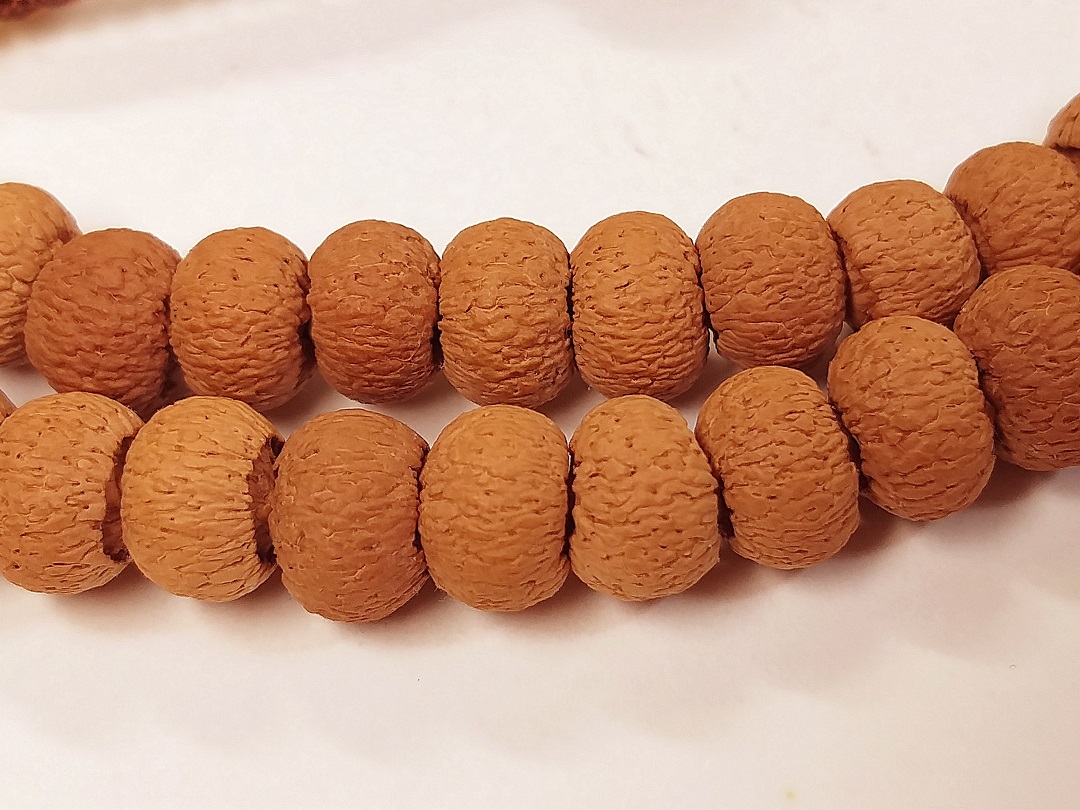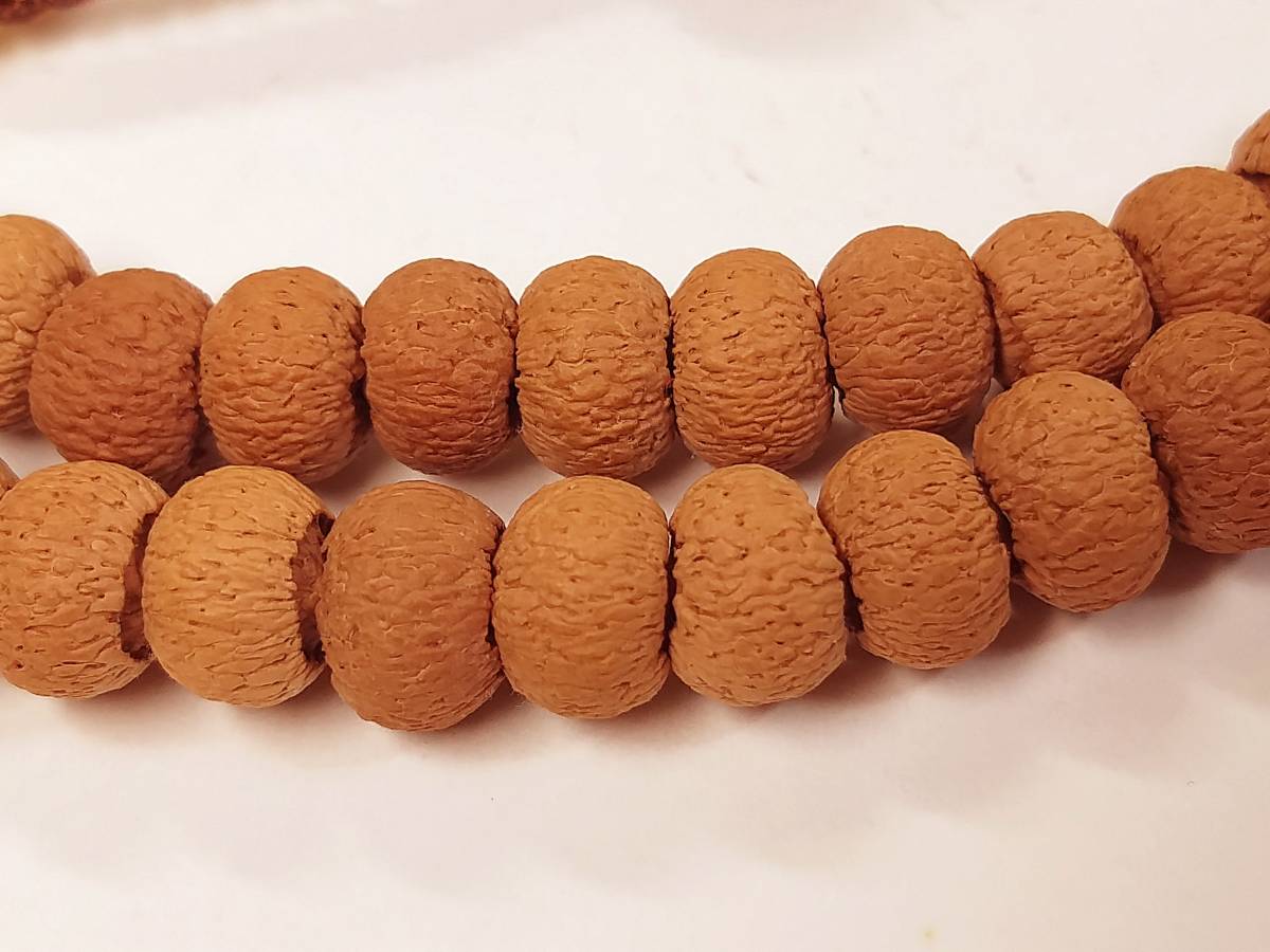 出品の写真をご覧下さい。写真でご覧頂ける蓮華菩提の玉の形状は、よく目にすることが出来る蓮華菩提の形状と異なります。現在出品のこの蓮華菩提の玉は、もっと丸みがあり、球状に非常に近いです。じつは、この種の蓮華菩提をインド産地の当地の人たちは、玄陀尼 蓮華菩提と呼んでいるものです。珍稀な蓮華菩提の中でも更に極珍な特殊菩提の種類になります。 形状はとても規則的で、粒が揃っています。密度は更に高く、硬度も更に大きいです。もっと大げさに言えば、ここ30年ほど世界の至る国に行ってきましたが、このような極珍稀な種類は見たことがありません。