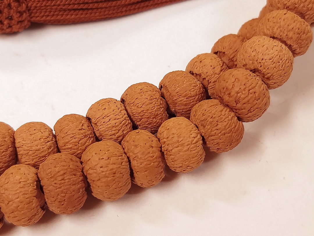 現在出品に使用の極珍品インド野生蓮華菩提の特徴は:①油性が、非常に良質で、②密度が最も高く、硬度が高く、成長速度が非常に遅くです。”鉄粒”と呼ばれております。石のように硬いです。③色合いが、最極上の純正な赤茶色です。④重厚感が充分あります。水に入れると沈んでしまいます。⑤木紋紋理は、非常に綺麗です。⑥この数珠は主玉全部で108粒になっており、色に差(色合の色ムラ)はありません。