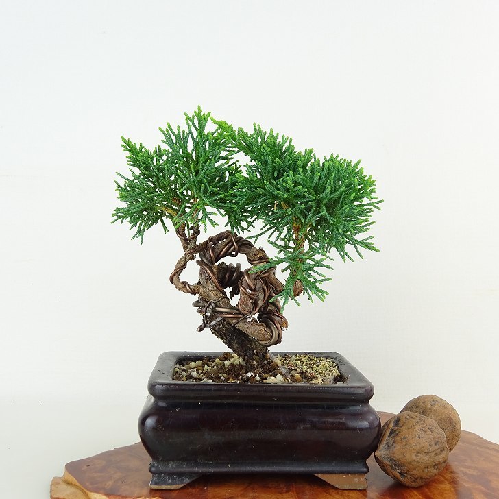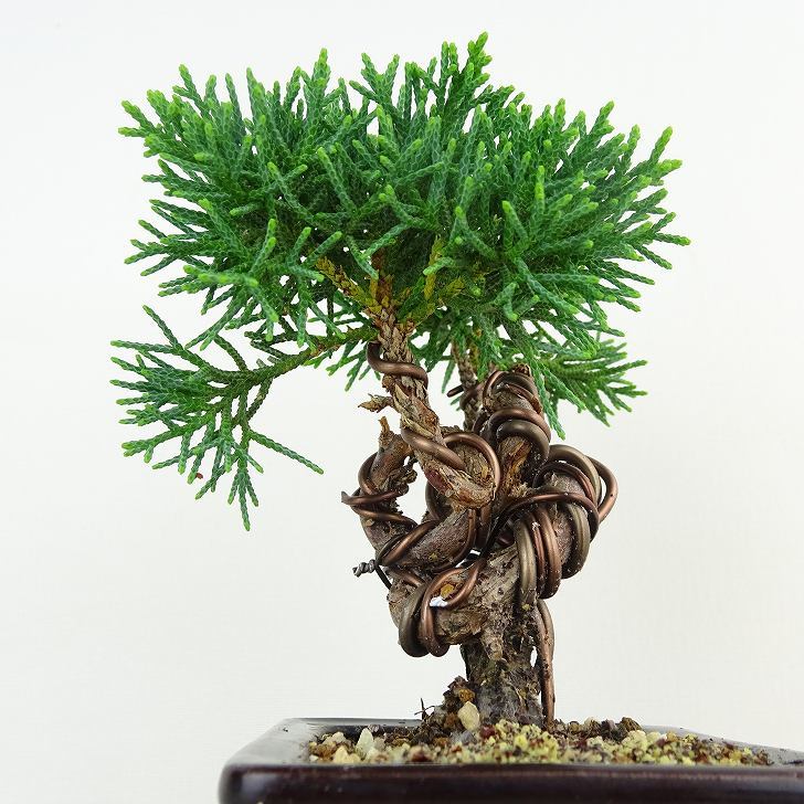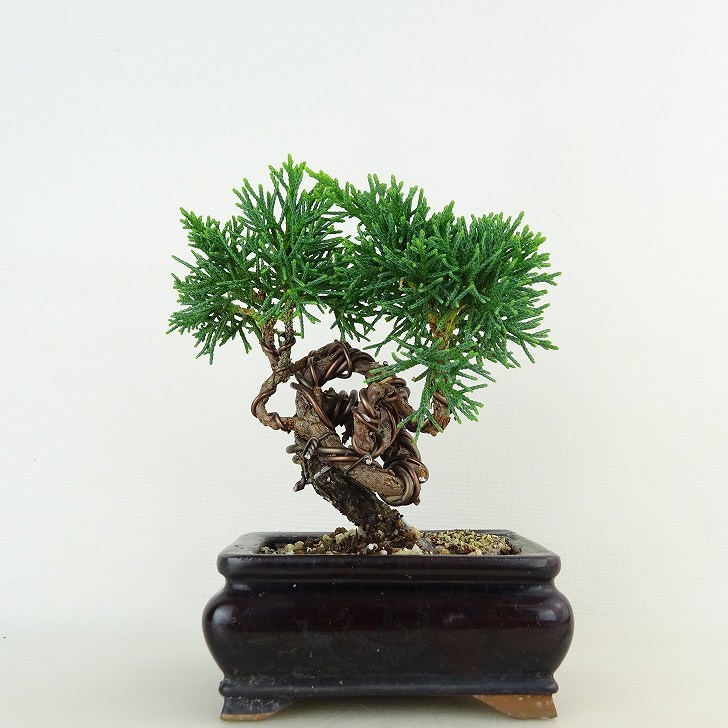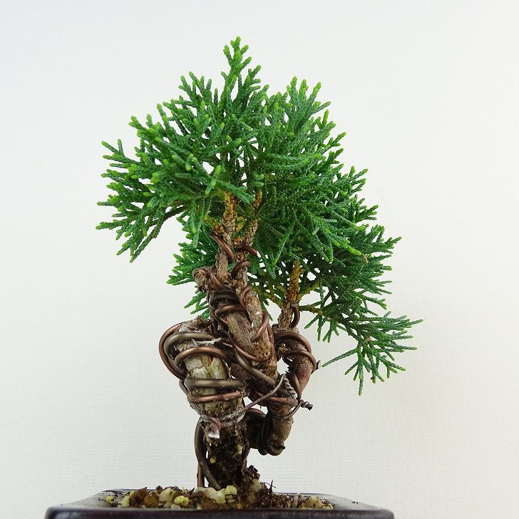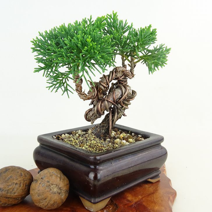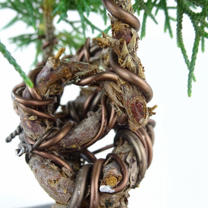 ■植物ですので撮影時期や季節によって剪定などの手入れにより写真から変化がございます。撮影日をご確認のうえ、ご注文ください。 【真柏盆栽】 シンパクの1番の特徴と言えば、短く締った紐状の葉と、わずかな水吸いでも生き抜くことができる強靱な幹枝です。自然界では積雪や強風などで押しつぶされ木部が露出し、朽ちて白骨化したものが見られます。枝の一部が白骨化したものを神(ジン)、幹の場合は舎利(シャリ)といいます。 |