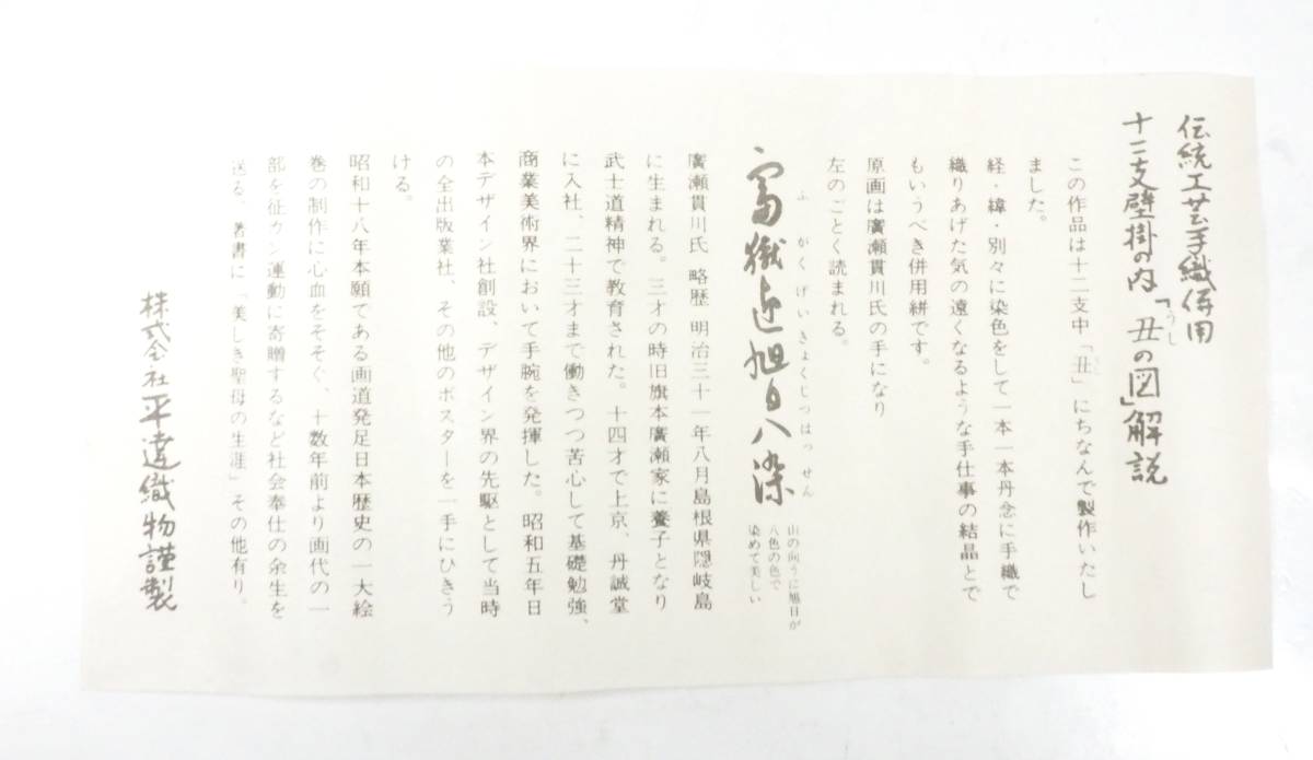 昭和ビンテージ 平達織物 廣瀬貫川 十二支壁掛 丑の図掛軸 箱付 落款有 絵織物 手織 併用絣 伝統工芸手織 1980年代 IAI512