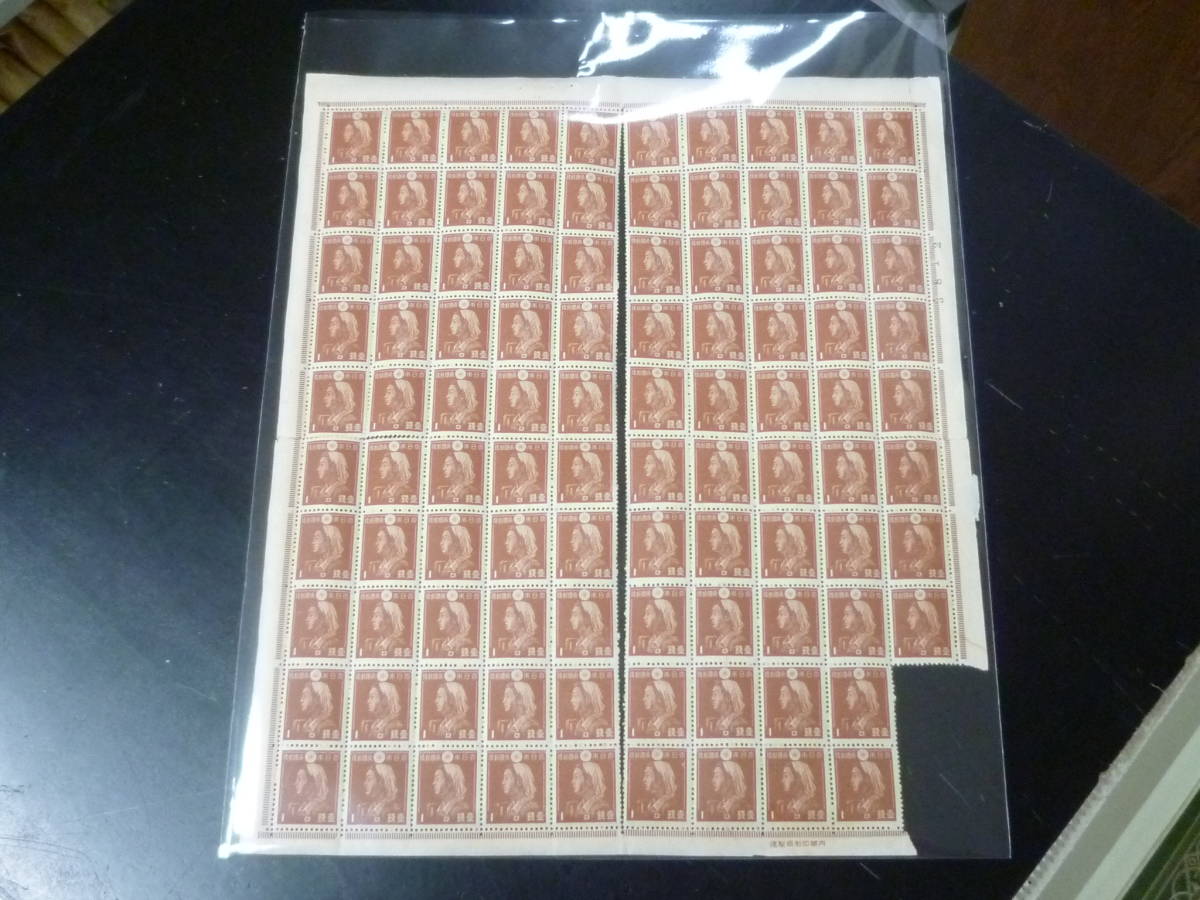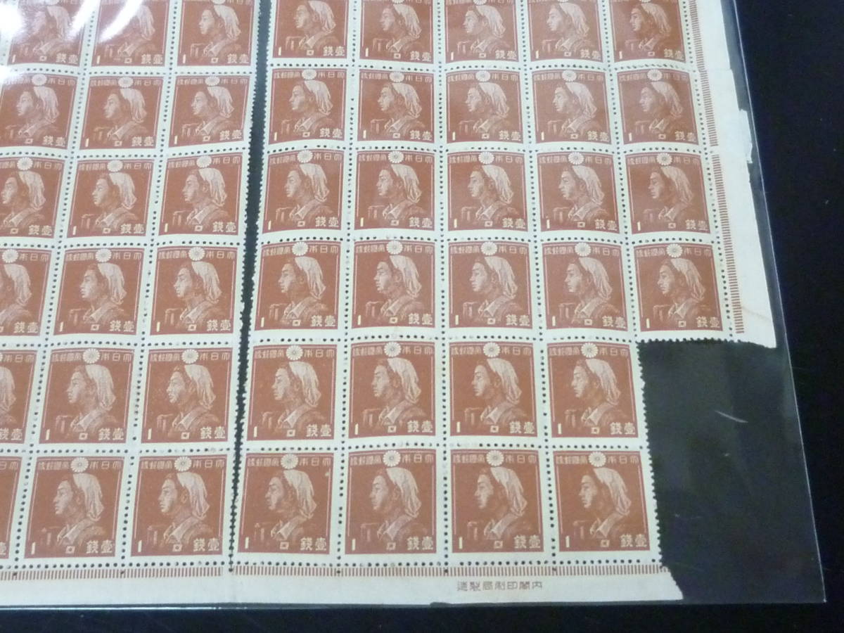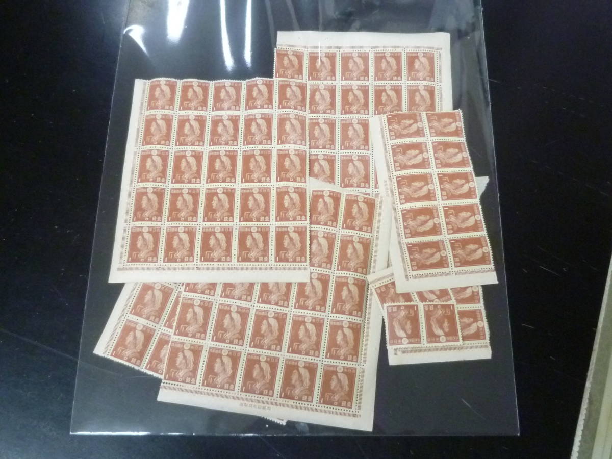 23 P №15 日本切手 1942-45年 #205 2次昭和 女子工員 1銭 各ブロック・バラ 計218枚 未使用 6枚分間紙付着有