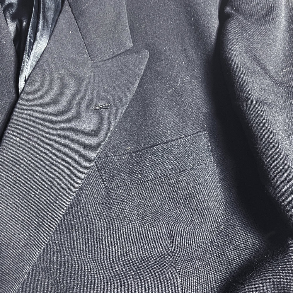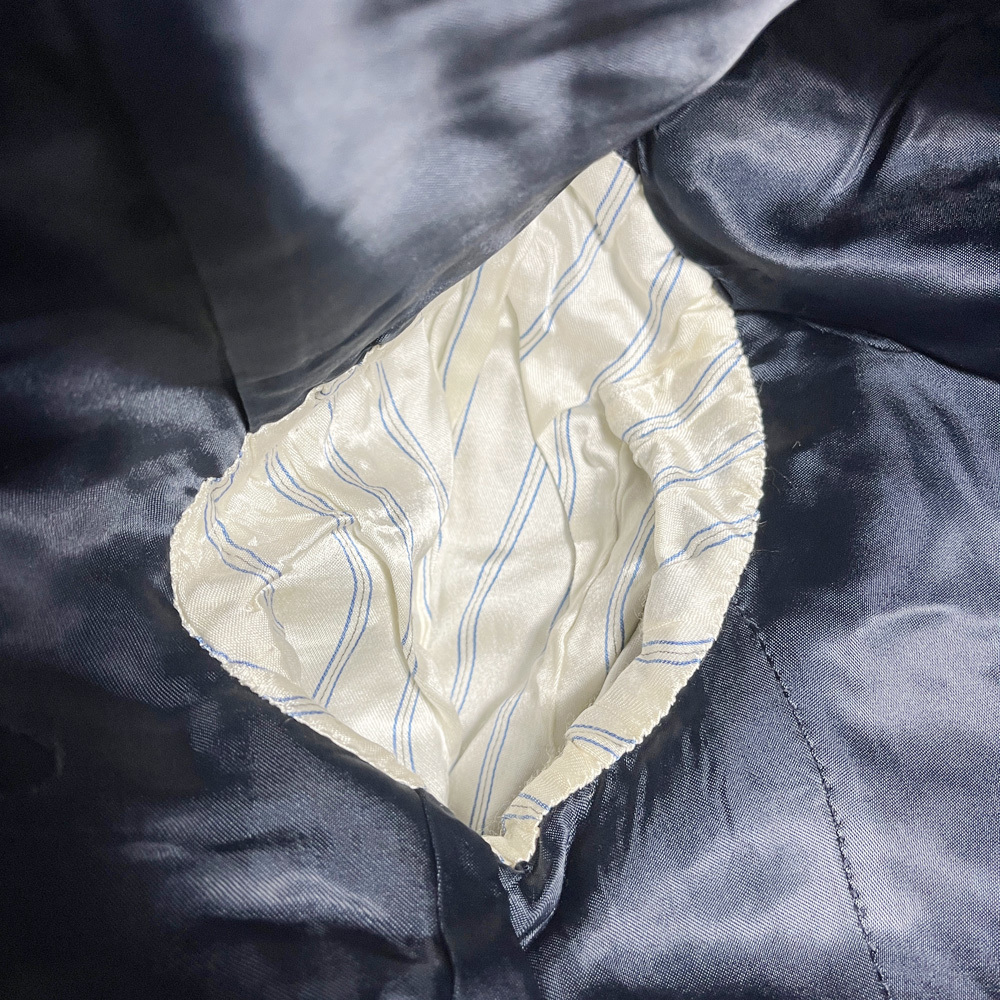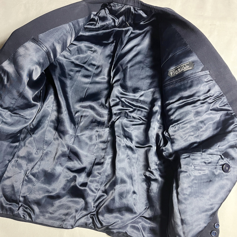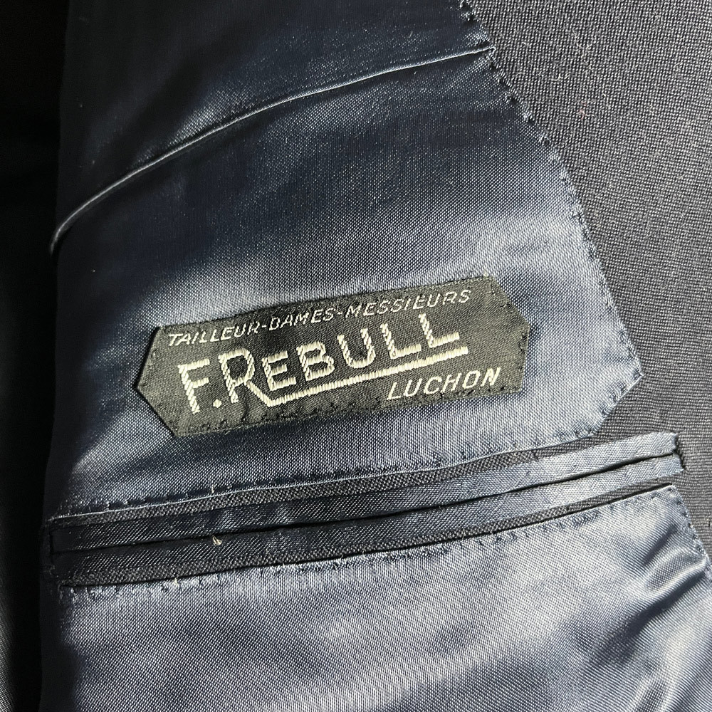 深いネイビーカラーの一着で、裏地もネイビーの、とても高級感溢れるシルク素材と思われる上質なライナーを完備。フランス南部,オート・ガロンヌ県の町 : LUCHON(ルション)を拠点としたテーラーである、F.REBULL社製の逸品。裏地にブランドレーベルもしっかりと残っております。