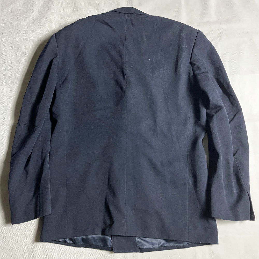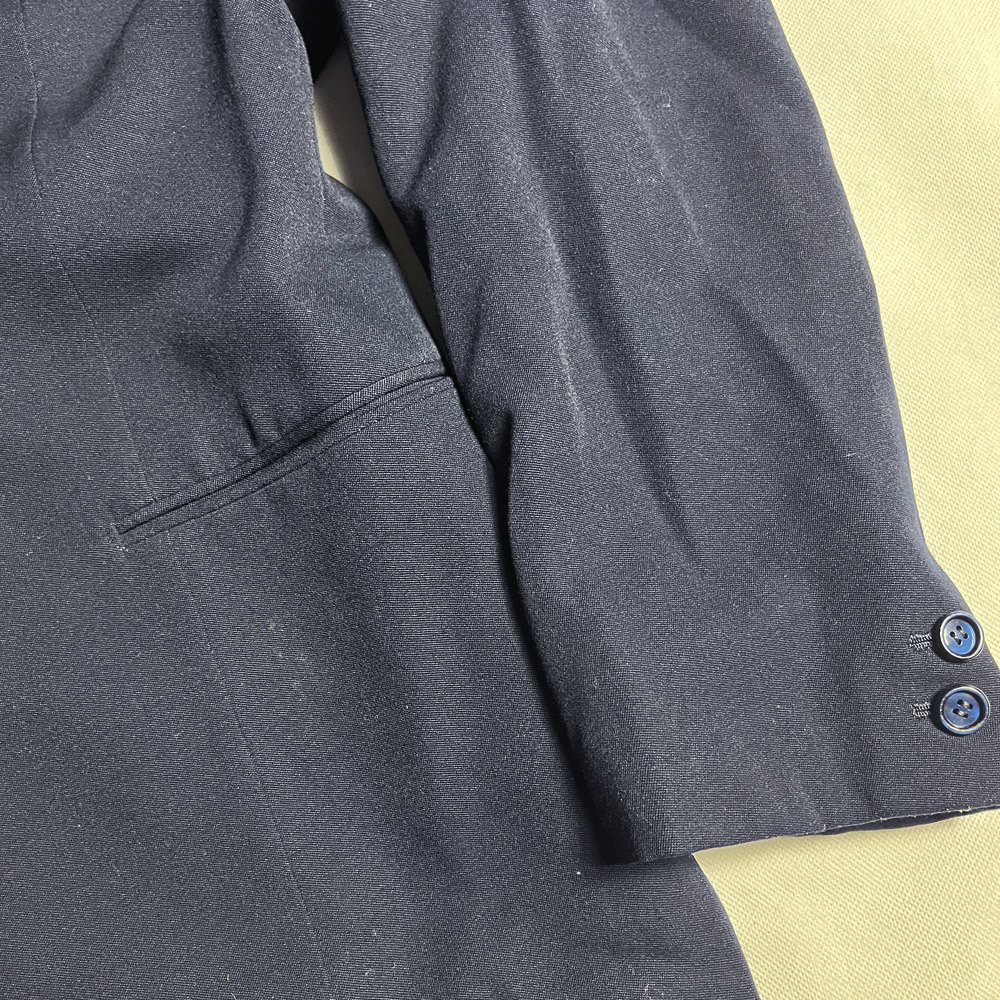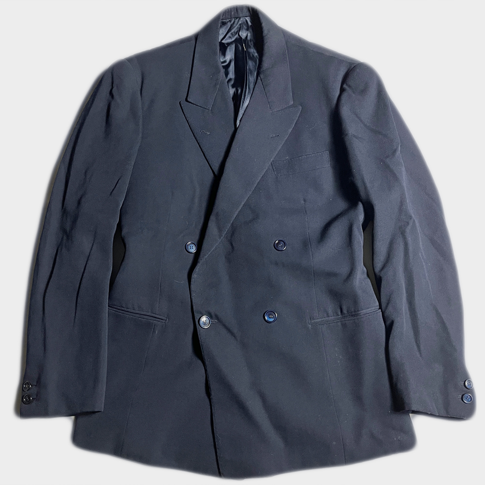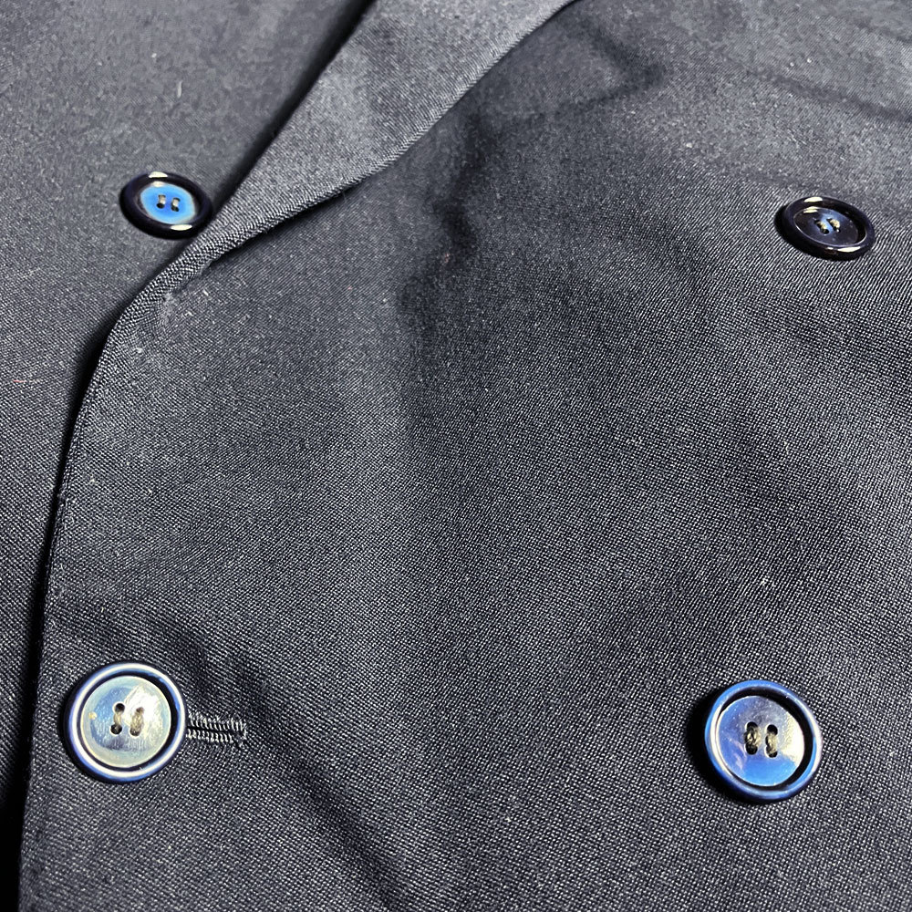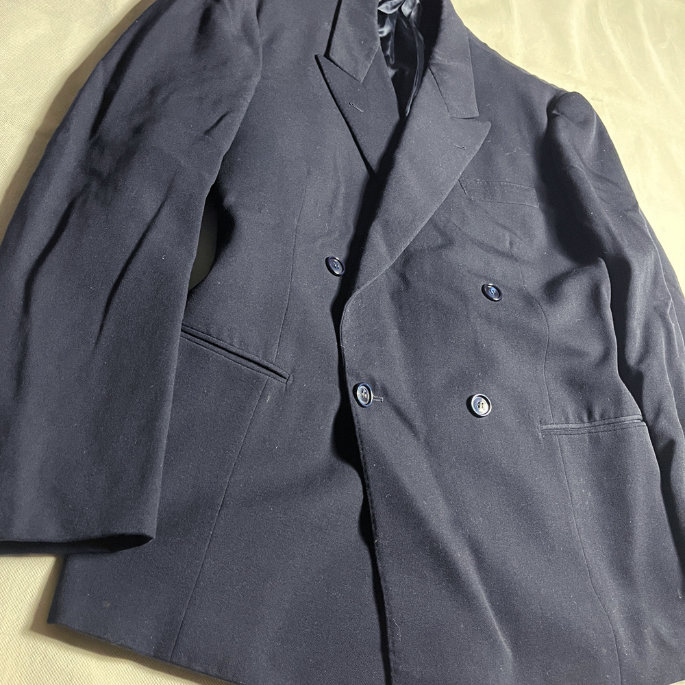 後ろ身頃が4枚ハギになっており、背中にフィットする様に計算され、フロントが4つボタンのダブルブレステッドタイプという、クラシカルな一品。ボタンが深いブルーカラーの美しい雰囲気となっています。