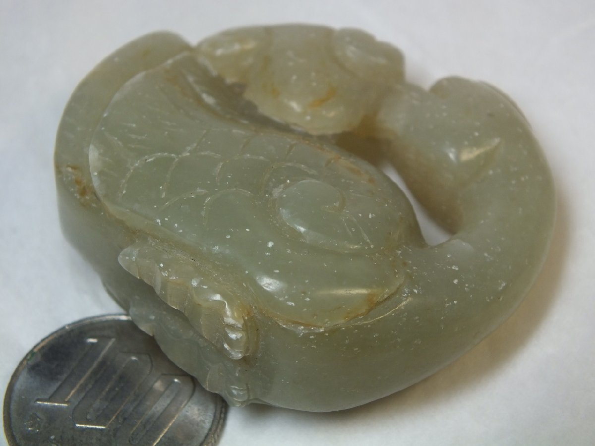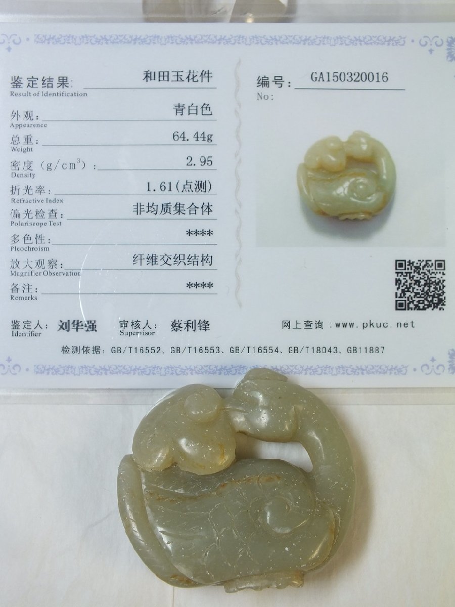 | ▲商品説明▲ | サイズ:52×48×19mm 重さ:64.4g 今は中国でも貴重な石、旧中国白玉(はくぎょく)です。製造加工の年代は不明。鵞鳥が彫り込まれています。石コレクションや置物に。 ◎北京大学宝石鑑定センターの鑑定証付き。 ●中国の西部砂漠地域(新彊、甘粛)の河床(今は水が無い所)から出る玉(ぎょく)は、中国では和田(ホータン)白玉と呼ばれ、何千年も前から珍重されています。翡翠の照りとは違い、ねっとりとした潤いがあります。中国の玉(ぎょく)コレクター垂涎の石です。 |