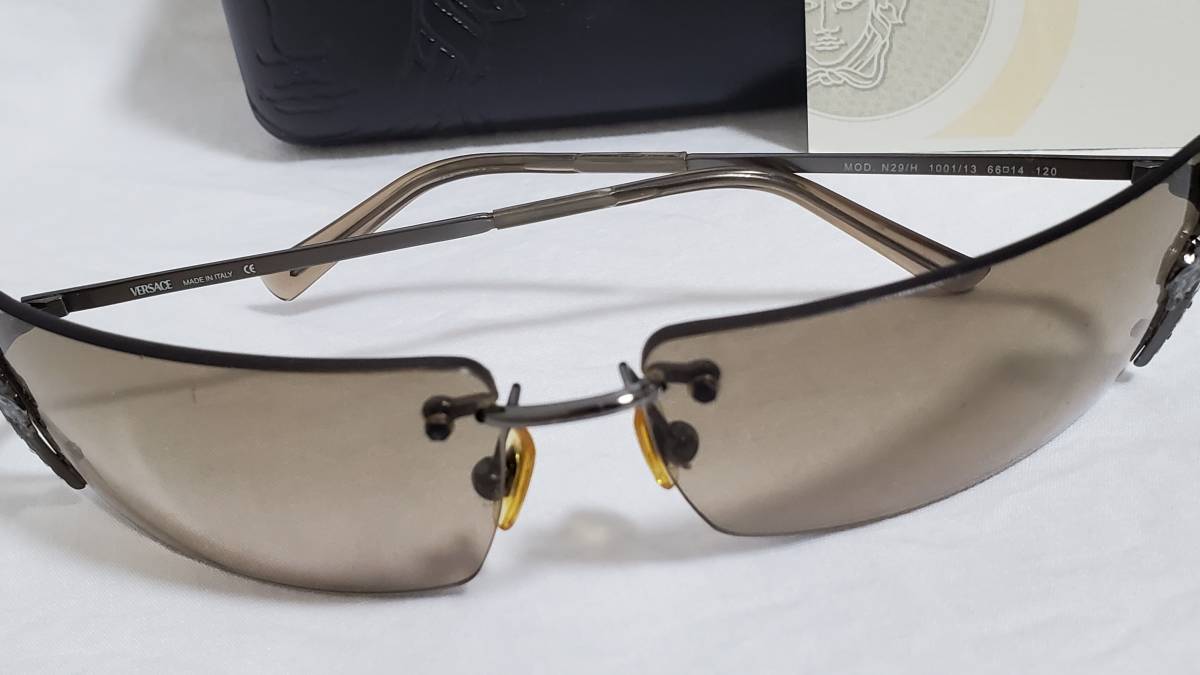 正規 絶版 レア VERSACEヴェルサーチ ヴィンテージ メデューサロゴ フレームレス スクエアサングラス 茶 アイコンクロス装飾 付属有○眼鏡
