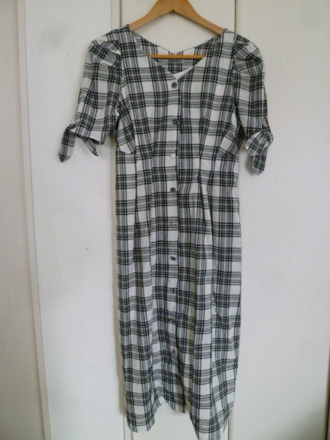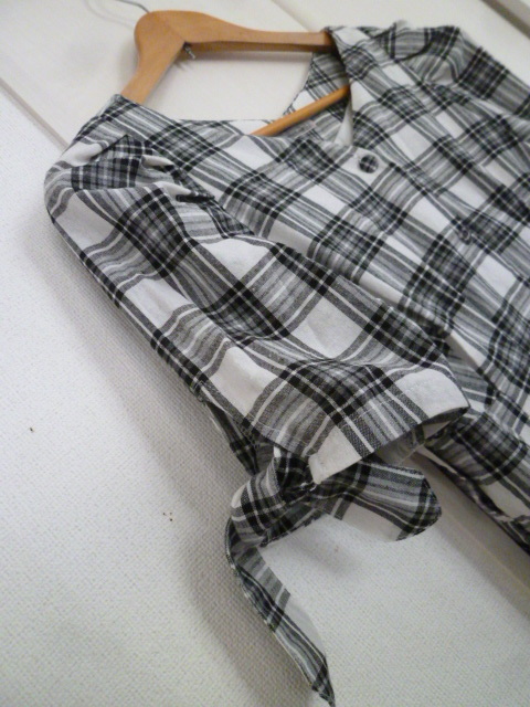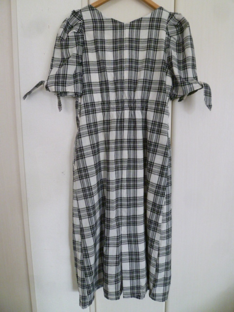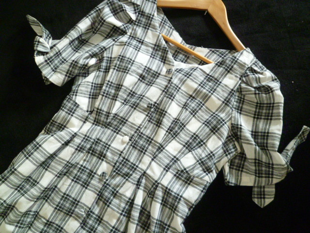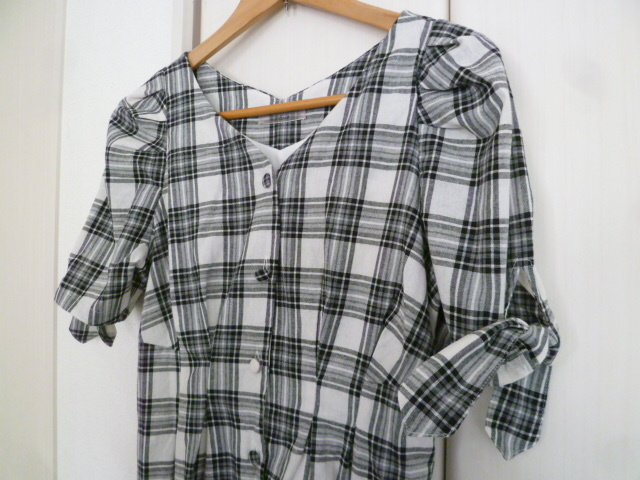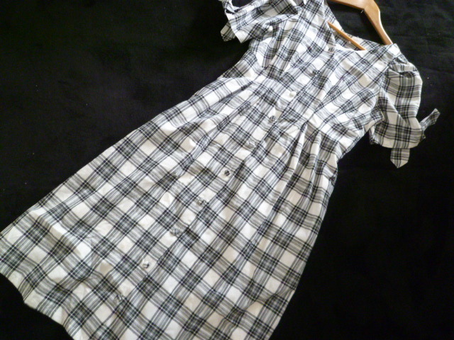 NICE CLAUP/ナイスクラップ◇モノトーンチェック柄パフスリーブ袖リボンくるみボタン前開きロングワンピースF◇a37