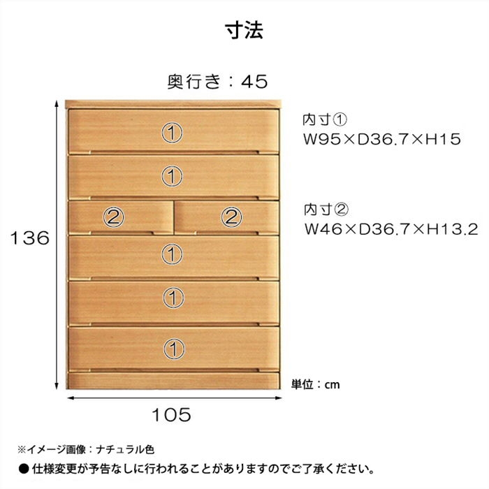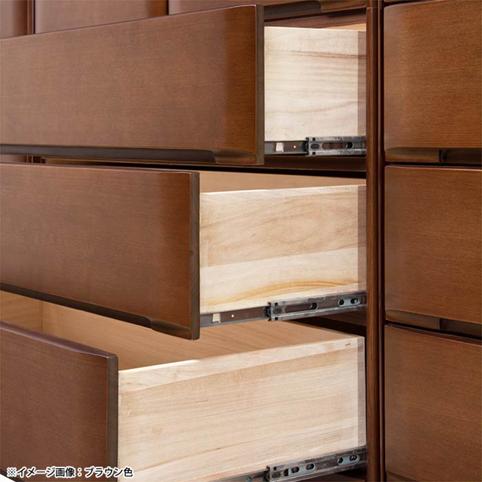 特  徴天板と引出前板にタモ突板を施した木の質感漂うチェスト。引出は丈夫なアリ組・ベタ底を採用、長引出は奥のものまで出し入れしやすいフルオープンスライドレール付き。小引き出しには、女性に嬉しいランジェリーボックス付き