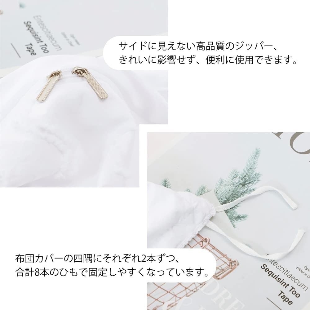 <内容と仕様>:「掛け布団カバー(1枚)」:短辺からファスナー付き / 布団留めひも付き ・ 「ボックスシーツ(1枚)」:全周ズレ防止ゴム付き / 通常サイズより大きめなので、高さ3-28cmの敷き布団とマットレスの底まで包む可能 ・ 「枕カバー(2枚)」:合わせ式