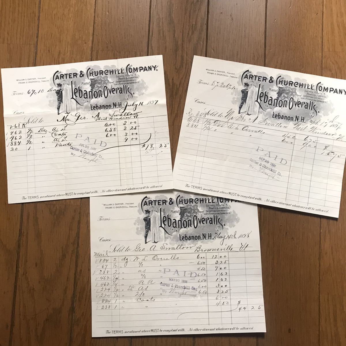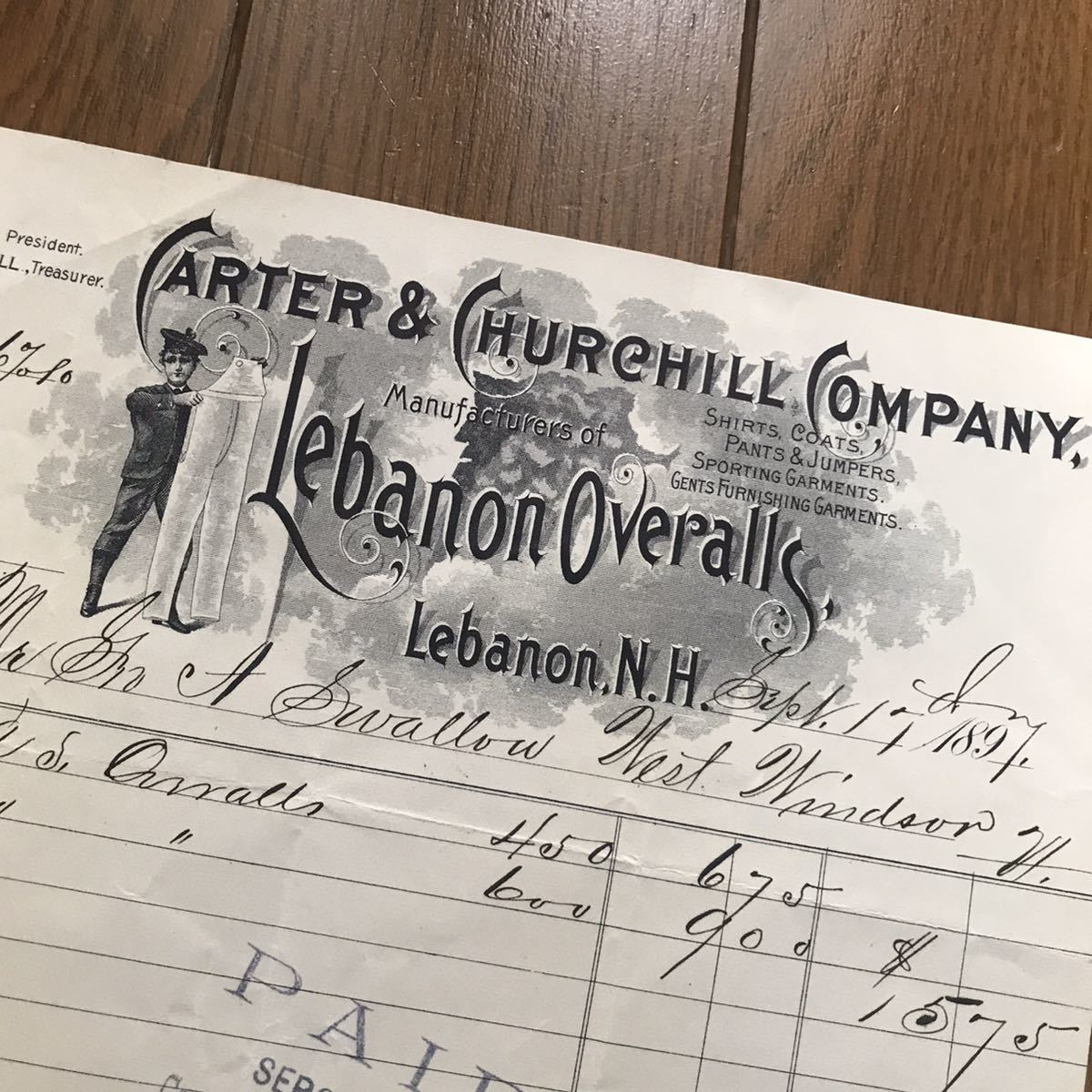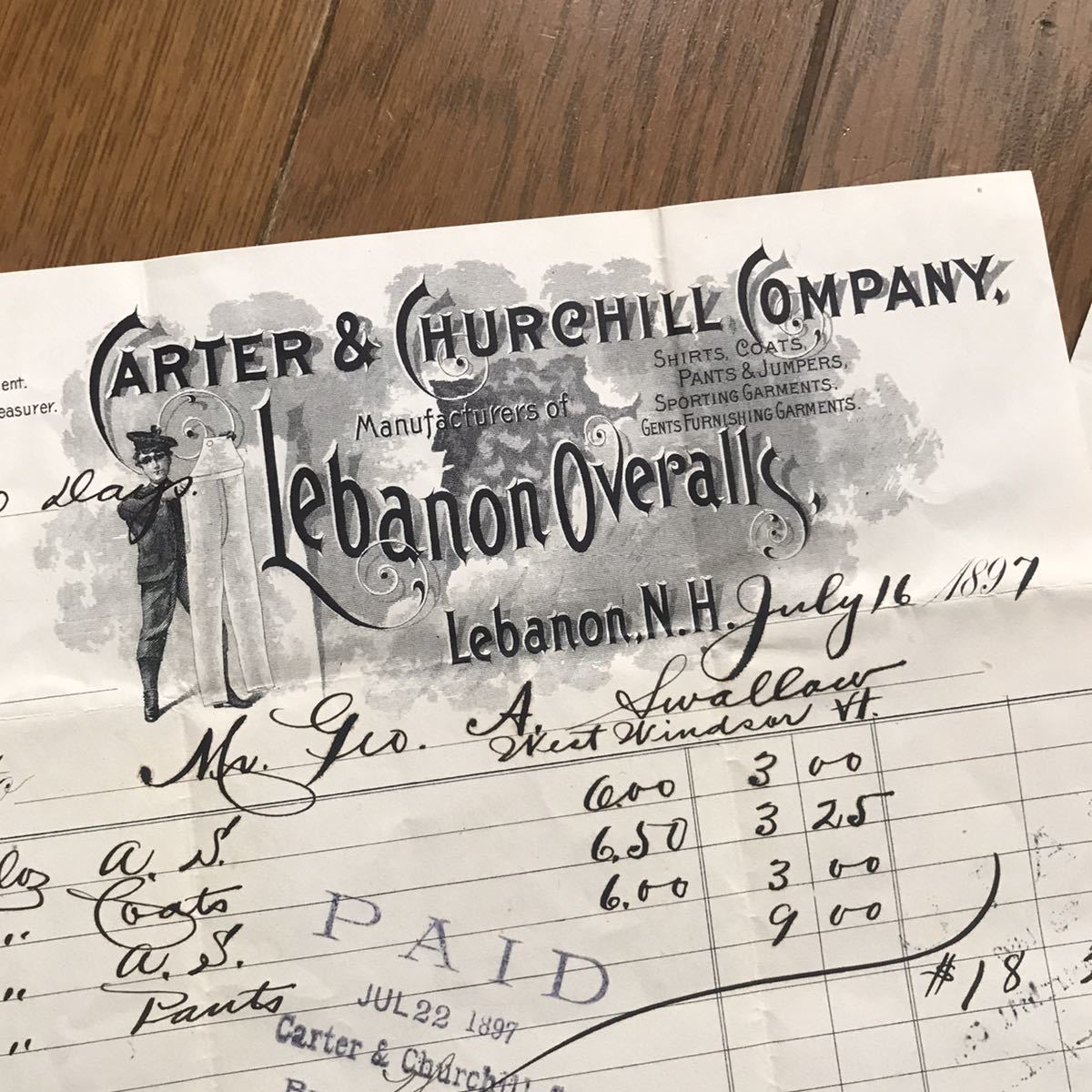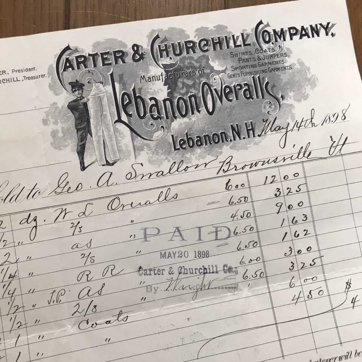 アンティーク!とても古いオーバーオールメーカー「Carter & Churchill Co/Lebanon New Hampshire」納品書です。*出品は1枚の価格です。落札後にお選びください。まとめ買いでお安くします。