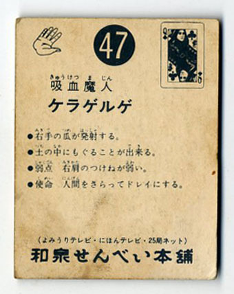 | ●超人バロム1 バロムワン ミニカード 47番 その1 吸血魔人ケラゲルゲ 和泉せんべい本舗 さいとうプロ・よみうりテレビ・東映 盗撮カード 即決 | |