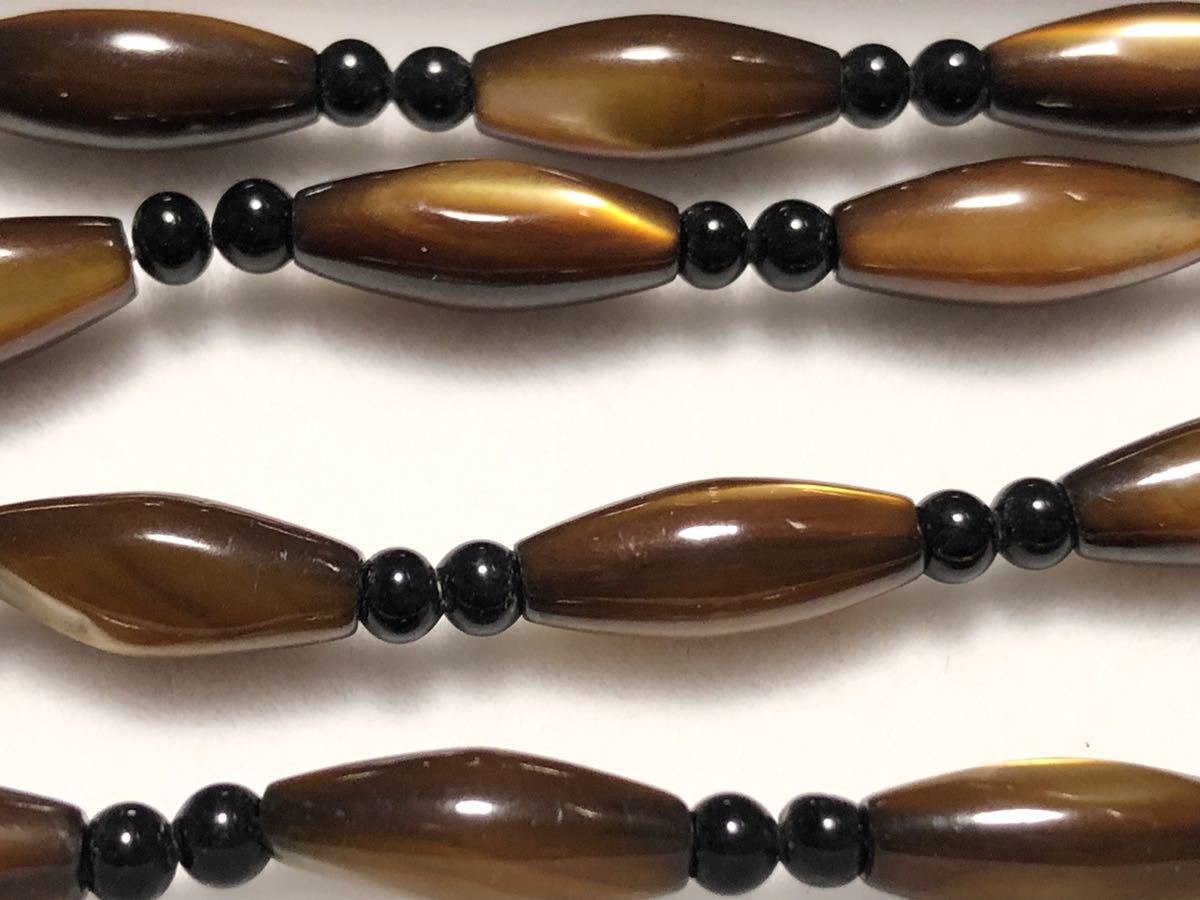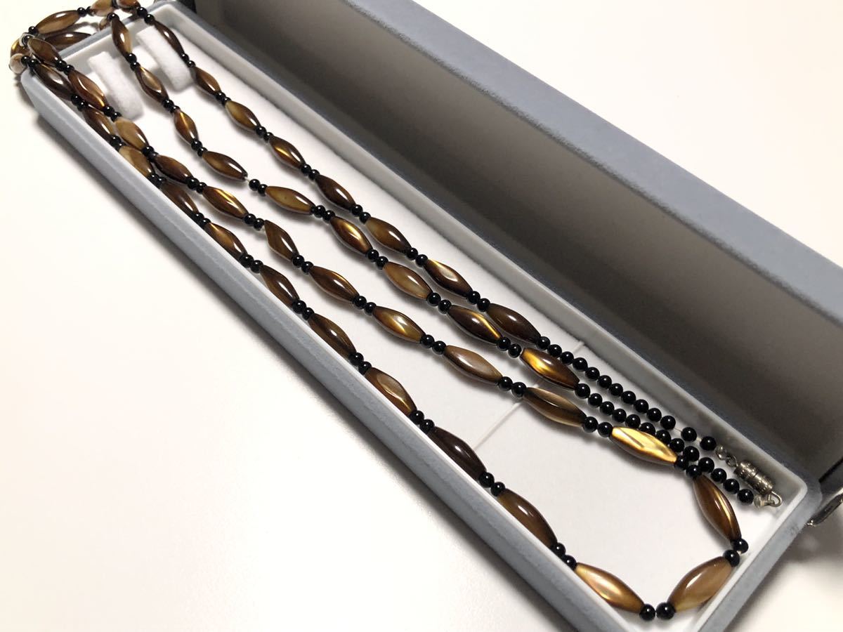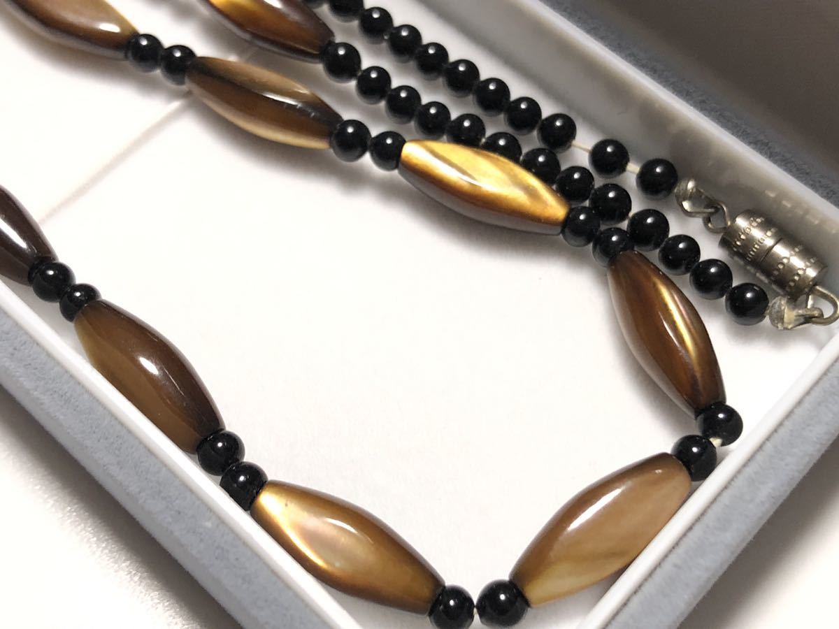 シェルを使用した、デザインロングネックレスです。金具部分に若干のサビがあります。