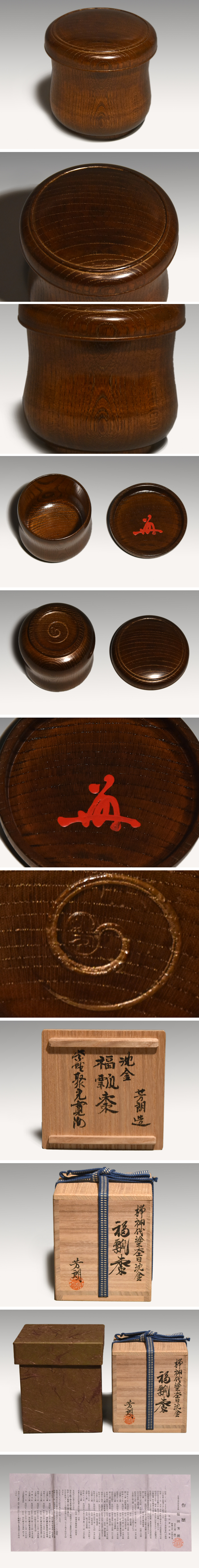 欅地に吹き漆で塗り重ね杢目の上に細かな刻みを入れてその刻みに金を入れた技法杢目沈金です。 高台内に「芳」の印が捺されております。 大徳寺塔頭聚光院住職の小野澤寛海老師の蓋裏に朱の在判が入り、箱書を認めております。 未使用でキズ欠点なく良い状態です。 |