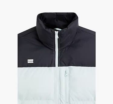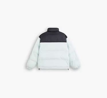 アイスブルー、パデッドデザイン、カラーブロックデザイン、胸元にロゴプリント、スタンドカラー、フロントにジップ式開閉、胸元にジップポケット、サイドにスリットポケット x 2、ロングスリーブ、ストレートな裾。