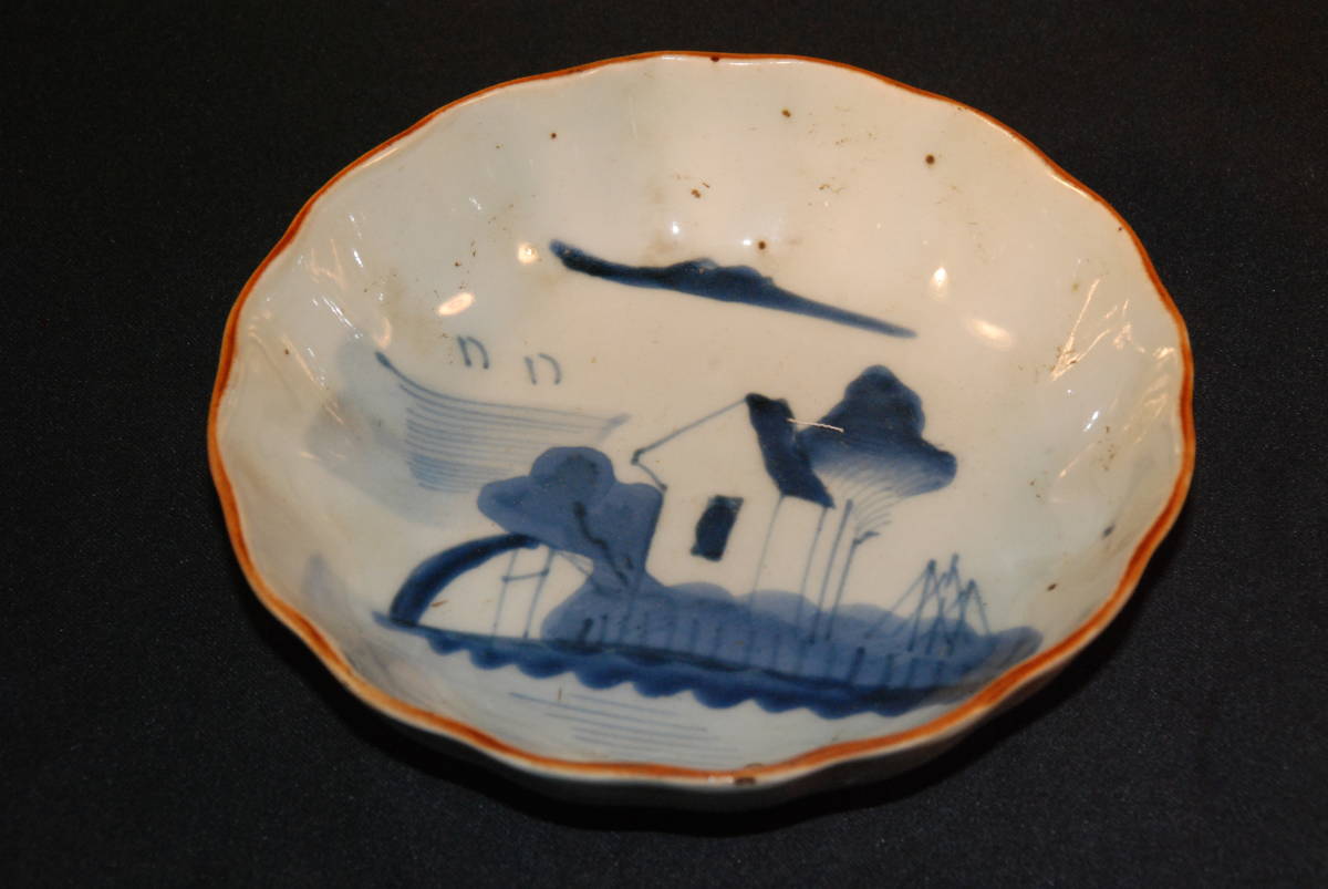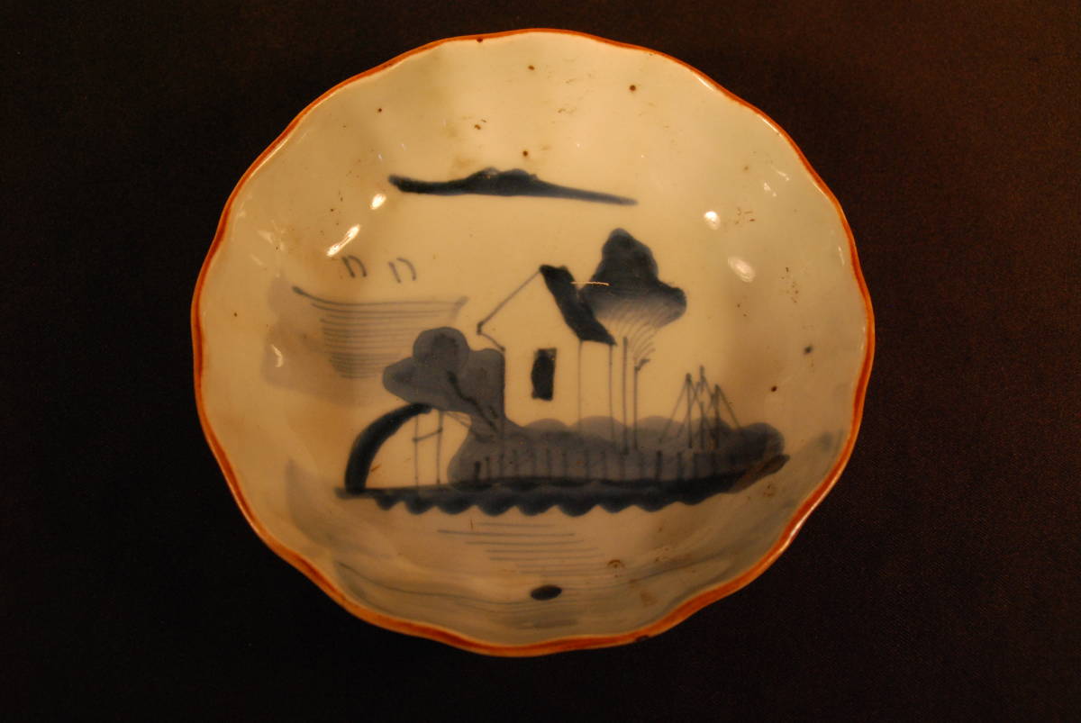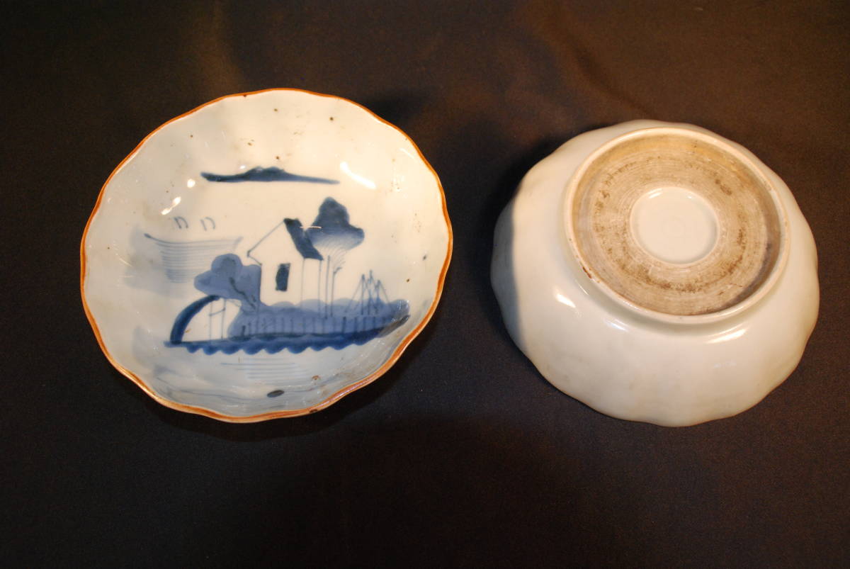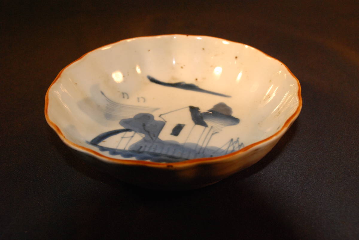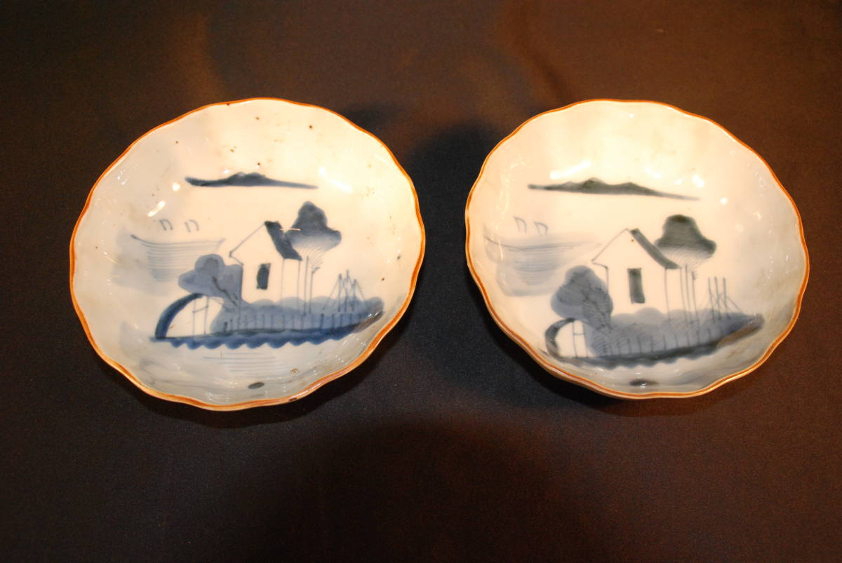 手書きの染付皿二枚です。風景が手書きで描かれています。