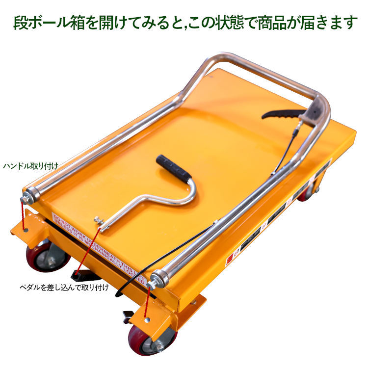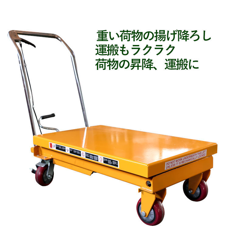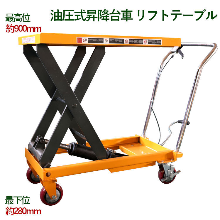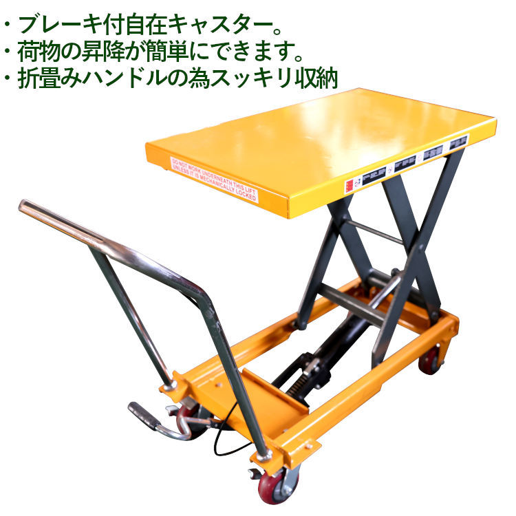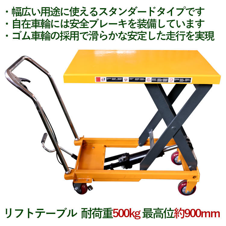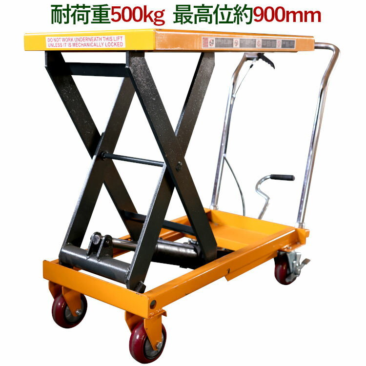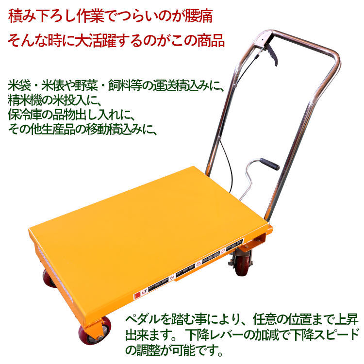 リフトテーブル 油圧式昇降台車 荷重500kg 最高位900mm 油圧式 手押し 台車 キャスター リフトアップ 昇降台 作業台 運搬 荷物 積み下ろし 折畳式 昇降台車 台車 スチール台車 平台車 運搬台車 業務用 昇降式作業台 安定 静音 運搬 倉庫 工場 業務用品 工業用品 農園 リフト 米袋・米俵や野菜・飼料等の運送積込みに、精米機の米投入に、保冷庫の品物出し入れに、その他生産品の移動積込みに、米袋・米俵や野菜・飼料の運送積込みに、折りたたみハンドルタイプ