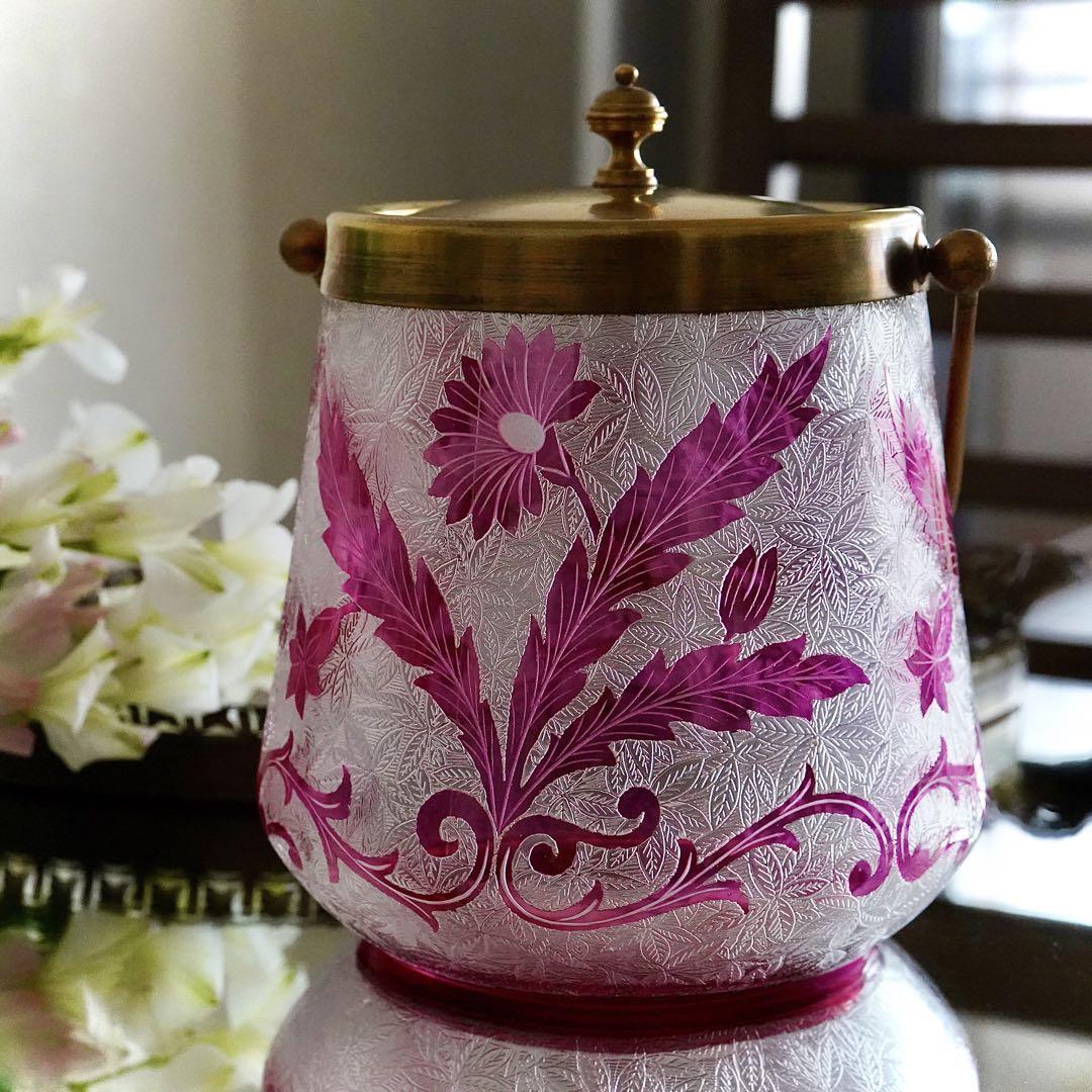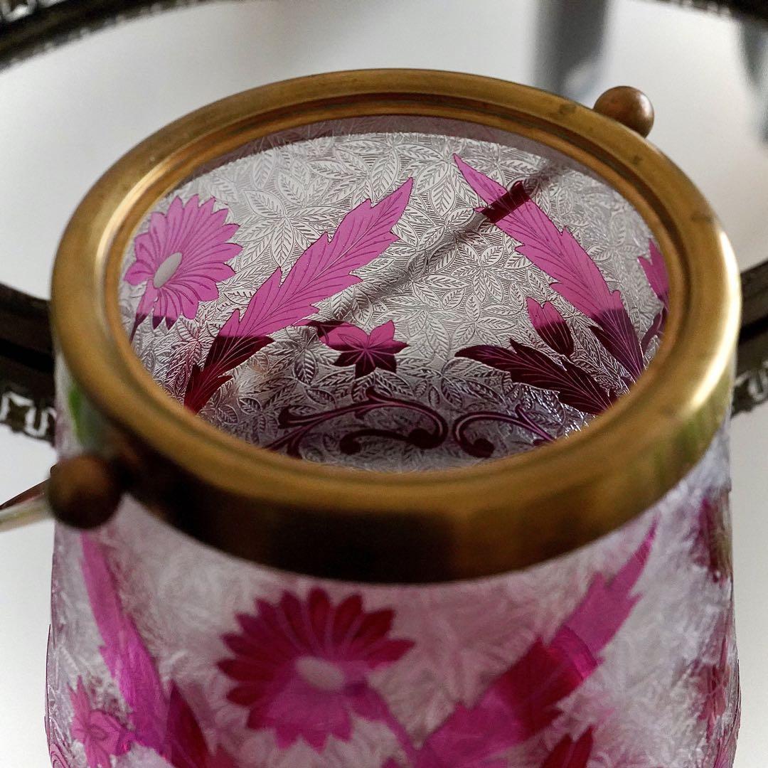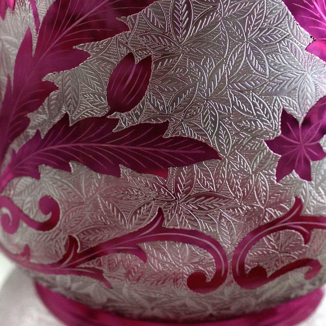 1900年前後にしかできなかった「アシッドエッチング」という酸化腐食技法が用いられた作品、透明のクリスタルガラスに赤色のクリスタルを被せその赤色を残しつつ酸で腐食させて凹凸を付け、細い針で模様を掘り込んでいくというとても手間のかかる技術で制作されたアンティークならではの作品です。