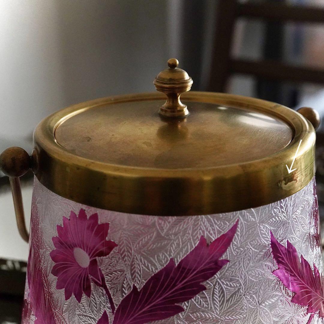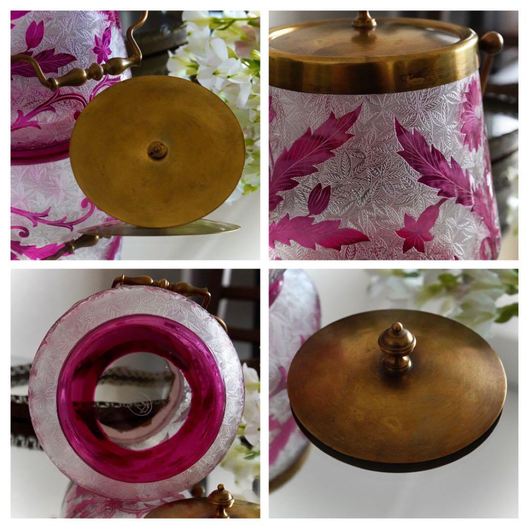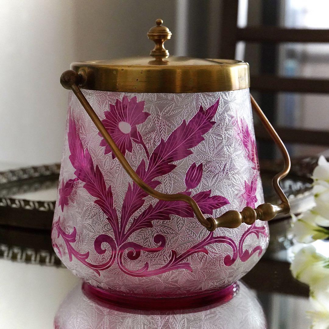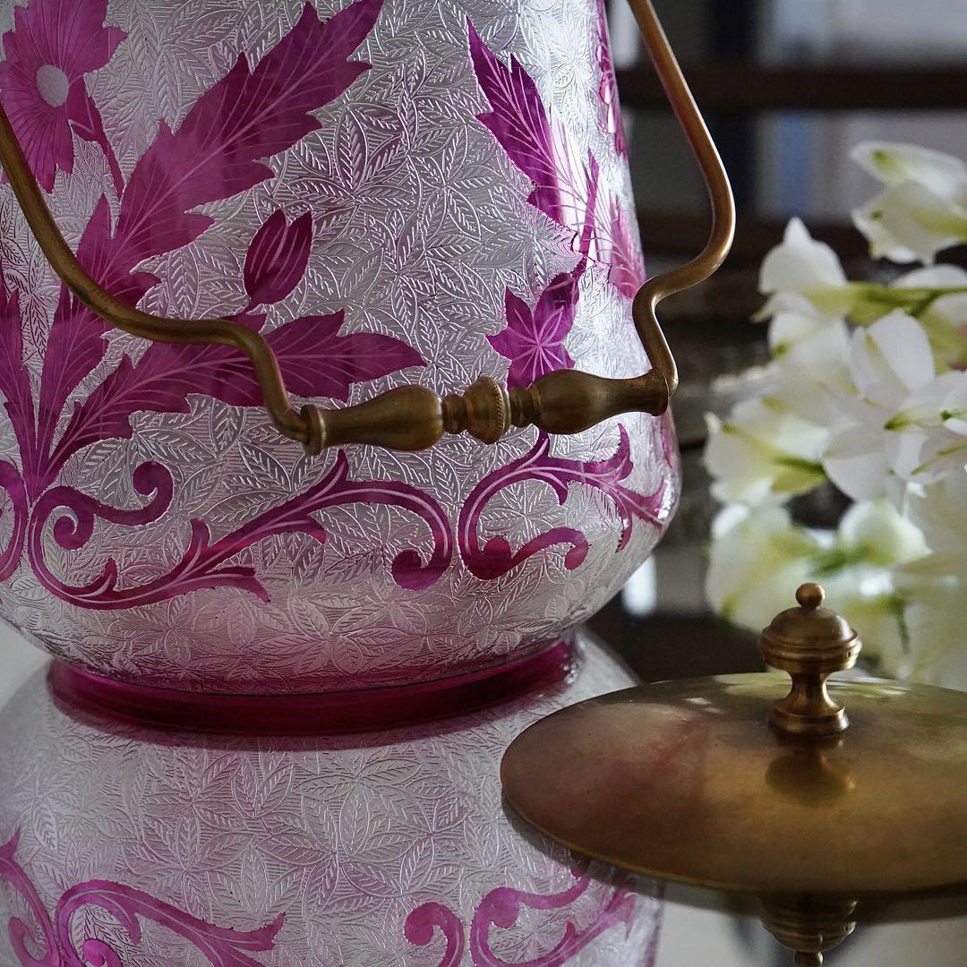 1900年前後にしかできなかった「アシッドエッチング」という酸化腐食技法が用いられた作品、透明のクリスタルガラスに赤色のクリスタルを被せその赤色を残しつつ酸で腐食させて凹凸を付け、細い針で模様を掘り込んでいくというとても手間のかかる技術で制作されたアンティークならではの作品です。