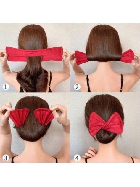 【使い方】①スリット部分に毛先を入れます。両手で同じ方向にヘアバンドを回して髪を束ね、平行に髪の末端まで持ち下げます。②髪を巻きつけながら内巻きにし、髪の根本まで巻き上げます。③両端を曲げリボンを作ります。④形を整え、完成です。