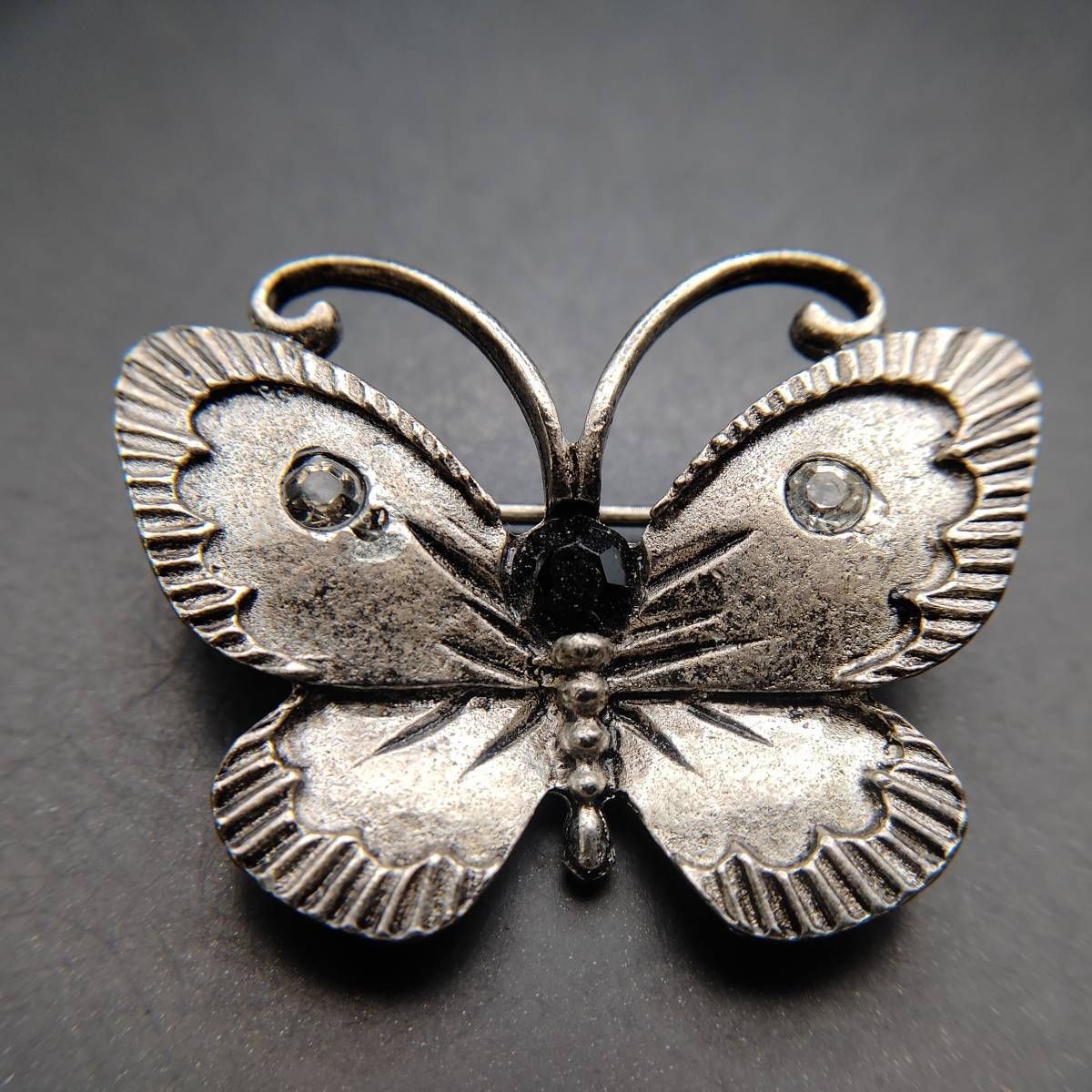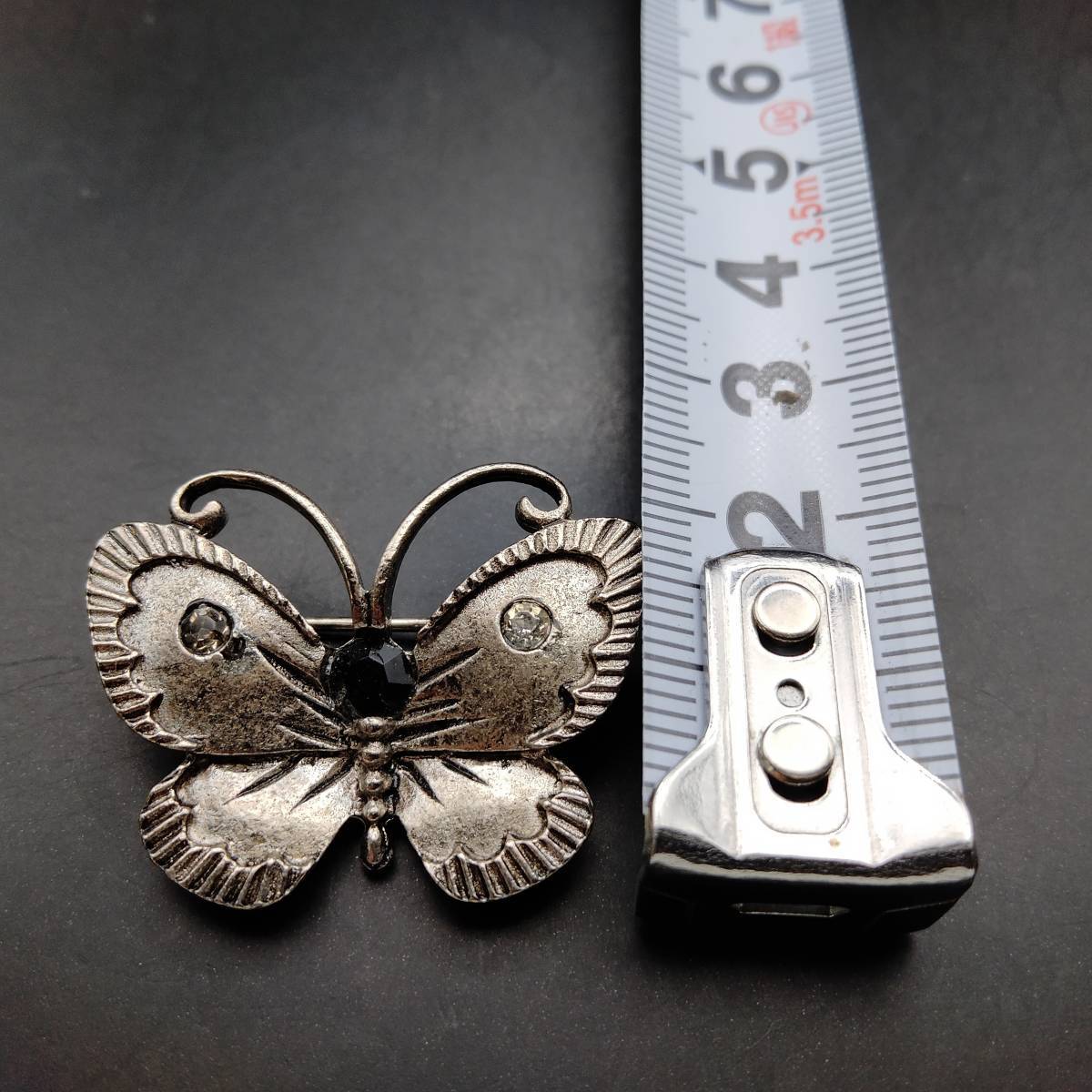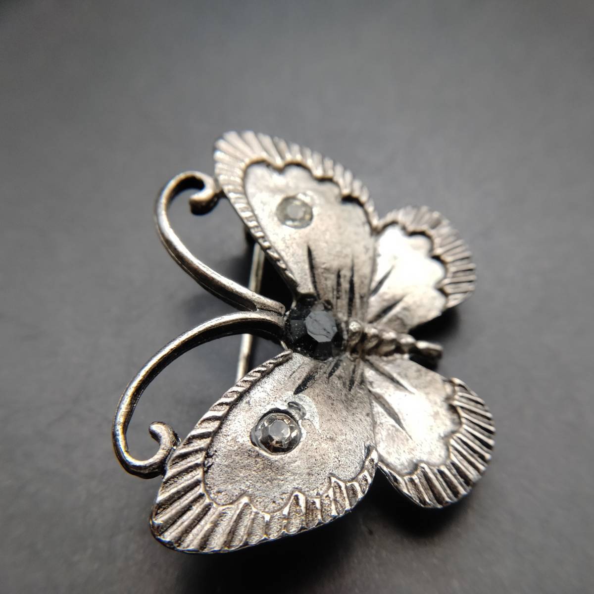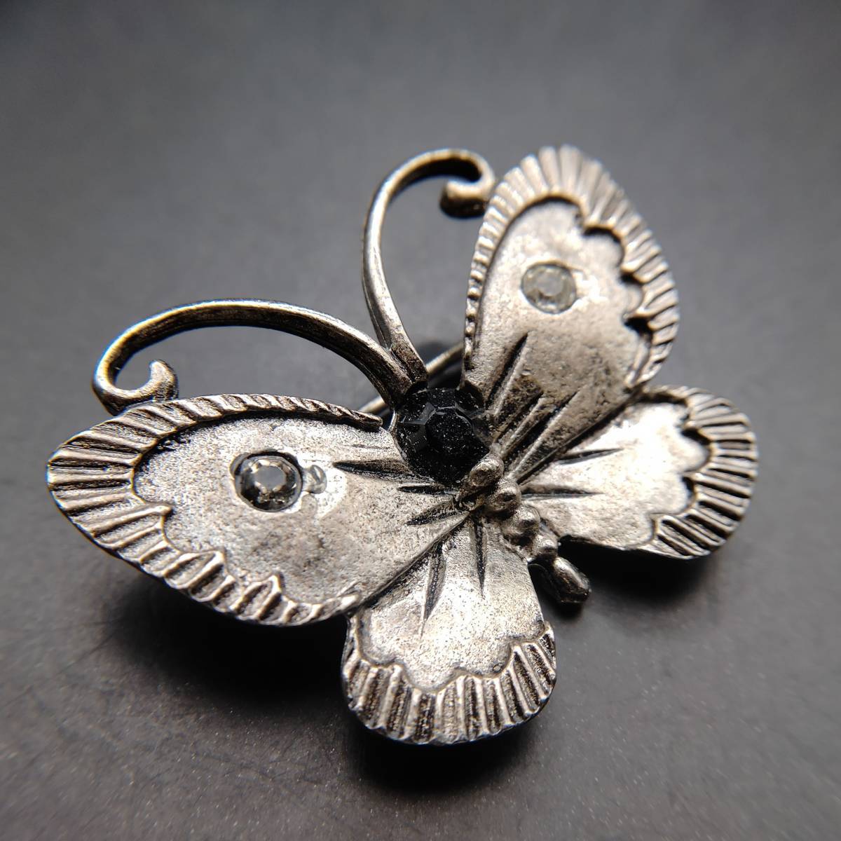 蝶々 昆虫 彫刻 オニキスカラー ストーン シルバートーン ビンテージ ブローチ 昭和レトロ コスチューム ジュエリー 輸入 7S-I