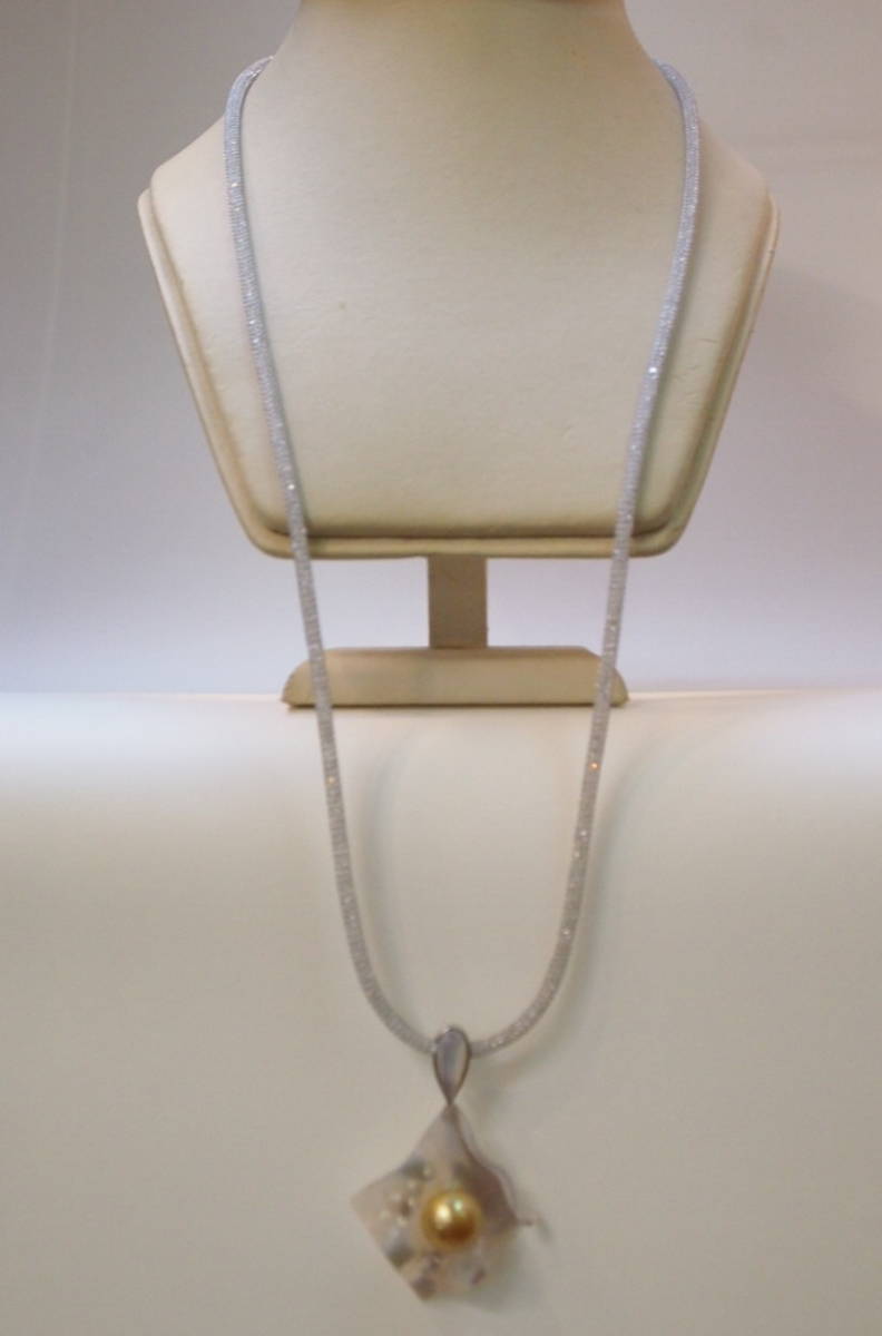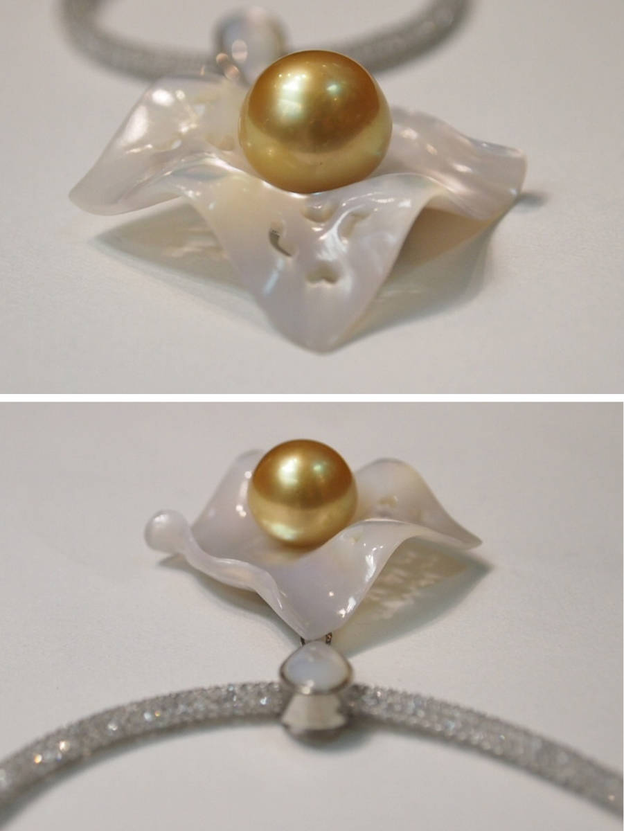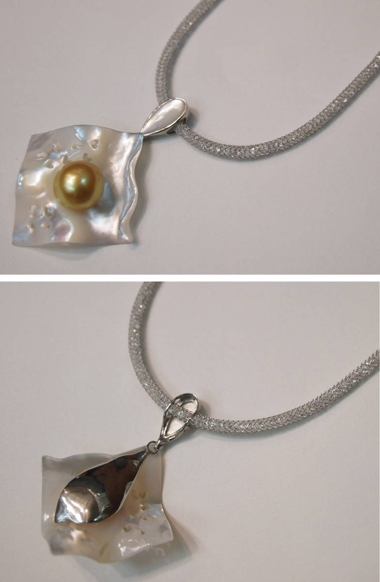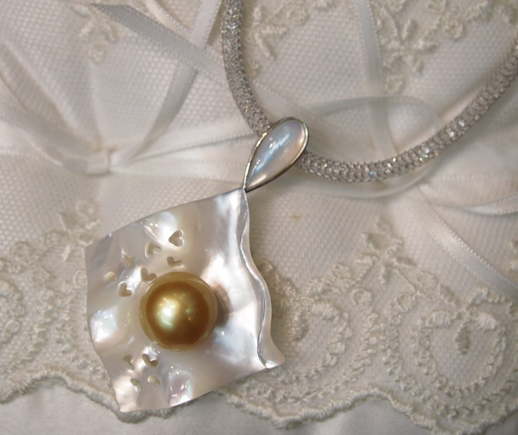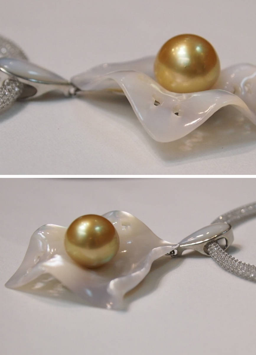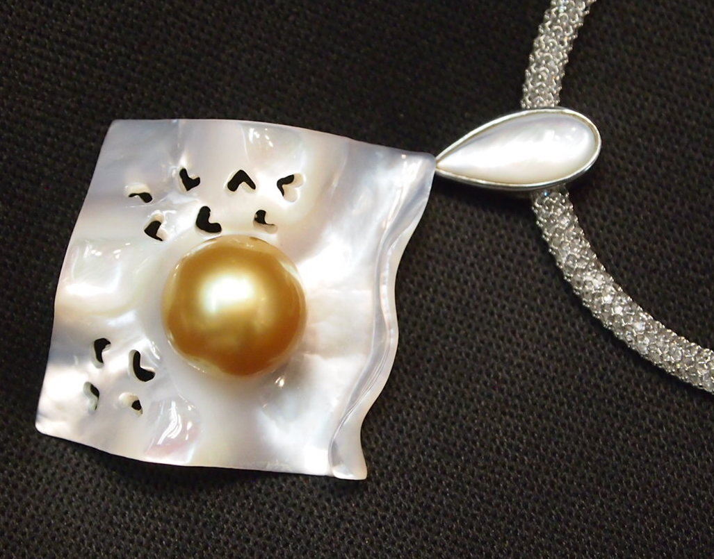大粒12ミリUPの南洋ゴールデン パールと立体感の有る曲線を活かした白蝶貝シェルを組み合わせたペンダントトップで、中央の真珠の美しい光沢と立体感ある形状の白蝶シェルがアートのような雰囲気を醸し出しています。