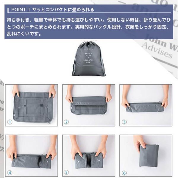 【使用ずにコンパクト】持ち手付き、軽量で単体でも持ち運びしやすい。使用しない時は、折り畳んでひとつのポーチにまとめられます。実用的なバックル設計、衣類をしっかり固定、乱れにくいです。