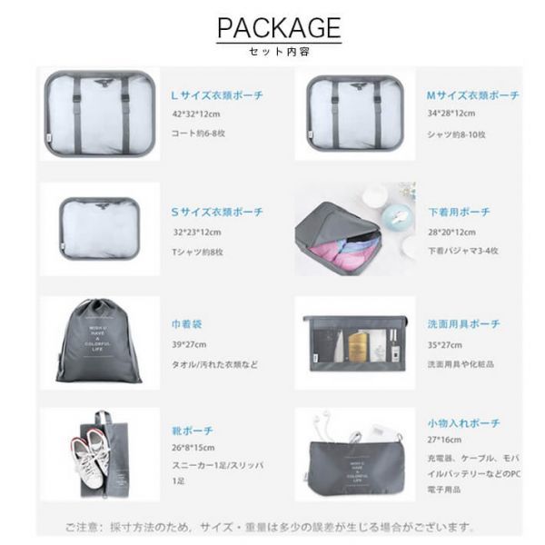 【収納力抜群】:8点セットのトラベルポッチは大小様々なサイズがあって、衣類、下着、靴、洗面用具、 PC周辺小物など日常用品を分類整理して旅行前日でもきれいに荷物がまとまります。収納苦手の方でも大丈夫です。