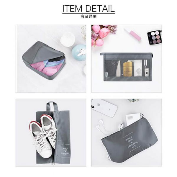 トラベルポーチ 8点セットアレンジケース パッキング 旅行 出張 便利グッズ 衣類 下着収納 洗面用具 PC周辺小物入れ 収納ポーチ】グレー
