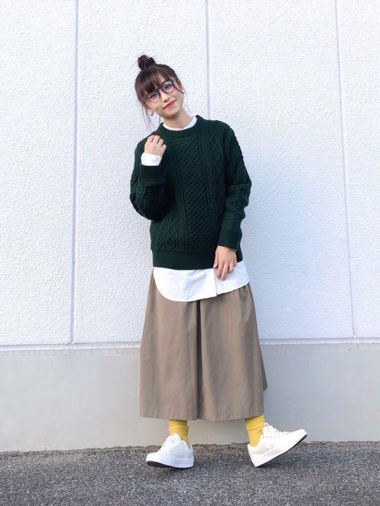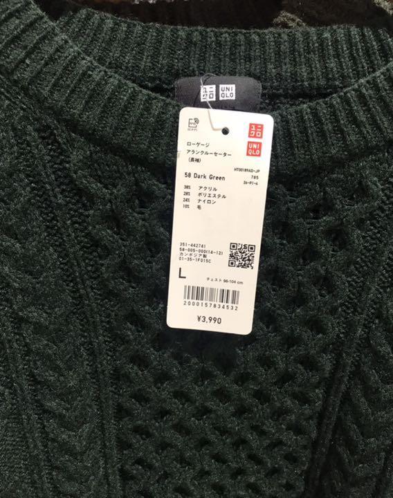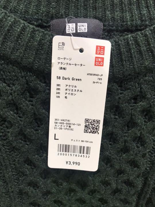 新品 ユニクロ ライトウェイトローゲージ アランクルーセーター(長袖)グリーン