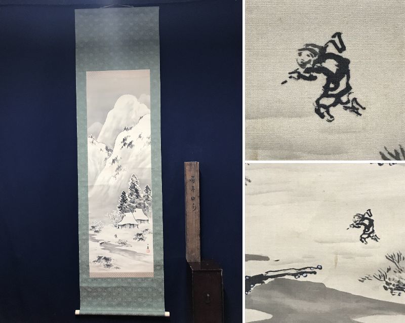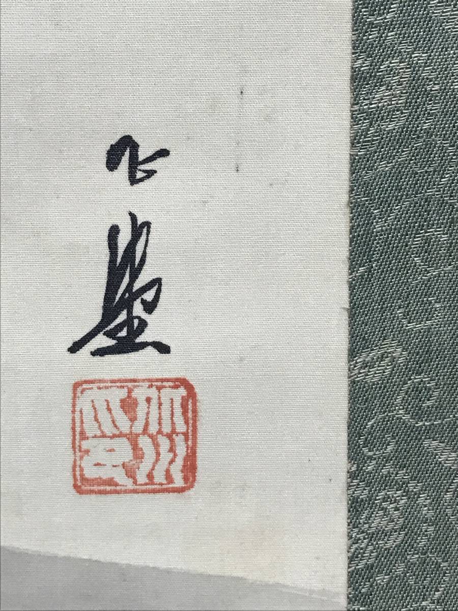 【作品状態】 本紙は絹本肉筆です。本紙は薄汚れ、多少の糊シミあります。表装は概ね良好ですが、天に薄い大きな水シミあります。巻裏に糊シミ、水シミあります。